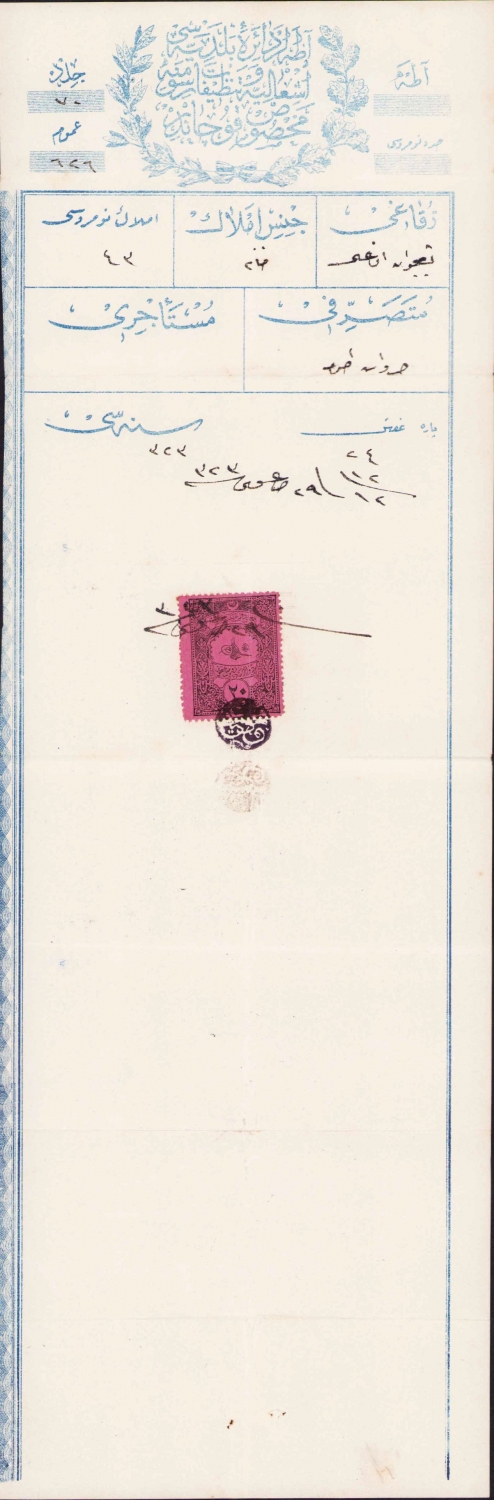 Osmanlı Adalar Belediyesi İşgaliye ve Aydınlatma Vergisi Koçanı, 1323 tarihli, pullu mühürlü, 13x40cm