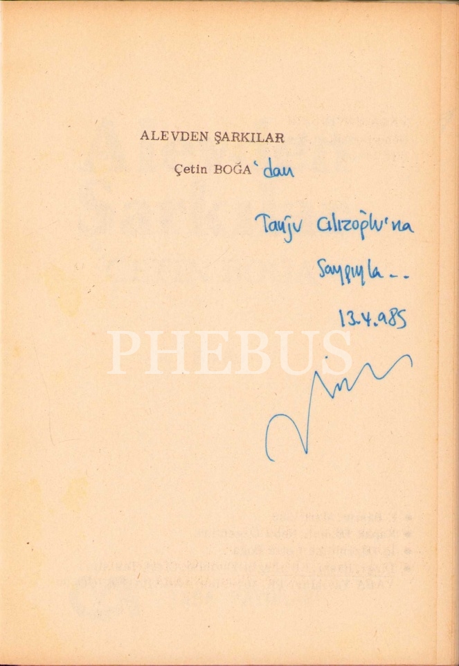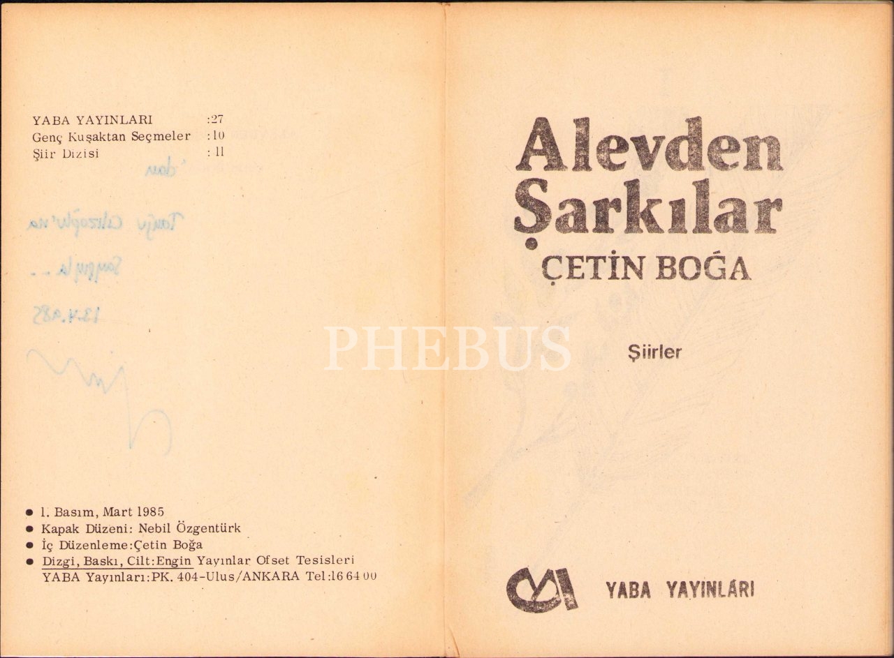 Alevden Şarkıları [Şiir], Çetin Boğa, yazarından ithaflı ve imzalı, Yaba Yayınları, Ankara 1985, 63 s., 13x19 cm, yorgun haliyle