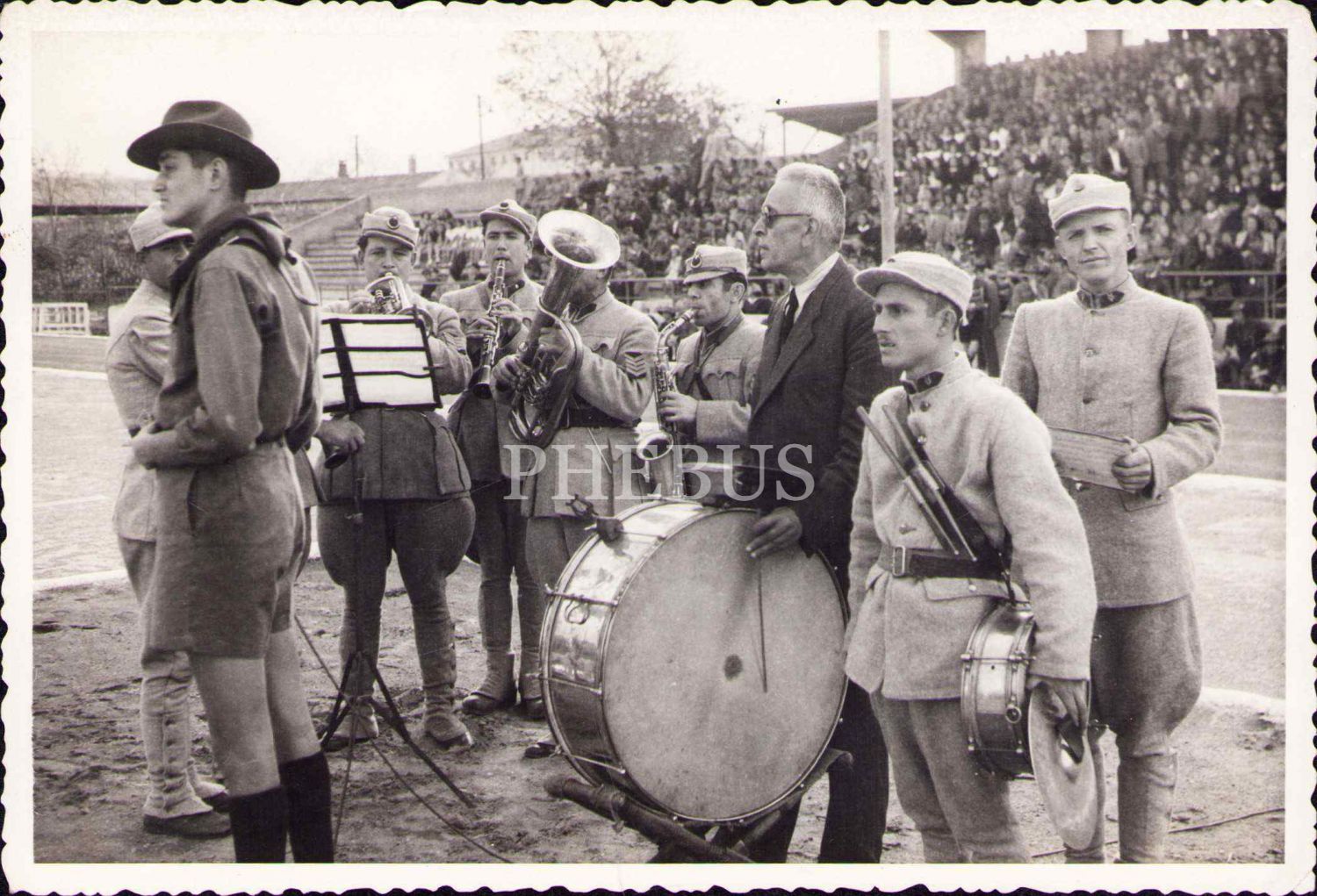 Kutlama esnasında bando takımı, 1933 tarihli, Foto Altınordu-İzmir damgalı, 12x18 cm, alt ve üst köşesi kırık haliyle