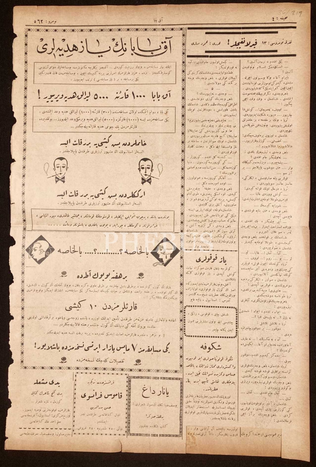 Osmanlıca Akbaba dergisi 562. sayı, 30 Nisan 1928, 4 sayfa, 30x45 cm, bir kenarı yıpranmış ve arka sayfası kesik haliyle