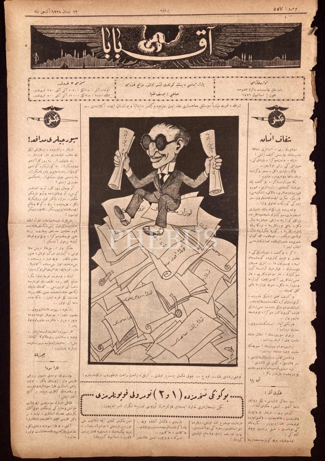 Osmanlıca Akbaba dergisi 557. sayı, 12 Nisan 1928, 4 sayfa, 30x45 cm, bir kenarı yıpranmış haliyle