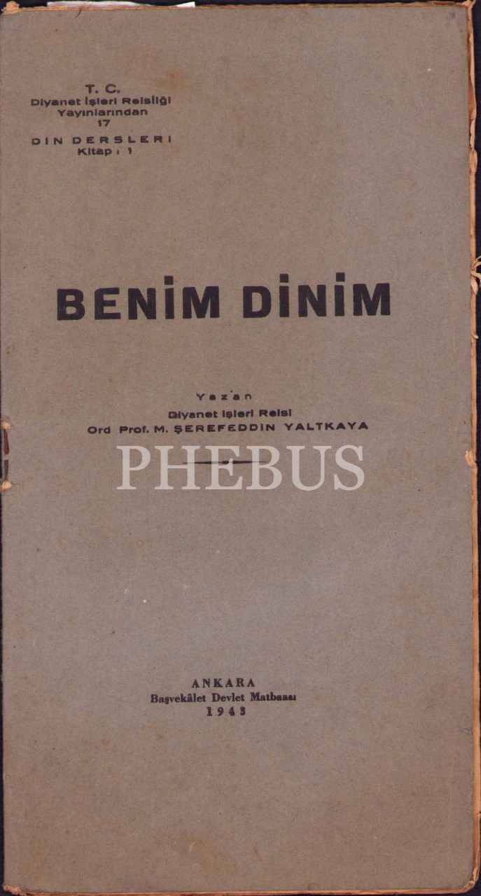 Benim Dinim, Şerefeddin Yaltkaya, Diyanet İşleri Reisliği Yayınları, Başvekâlet Devlet Matbaası, Ankara 1943, 44 s., 13x23 cm, kapağı yorgun haliyle