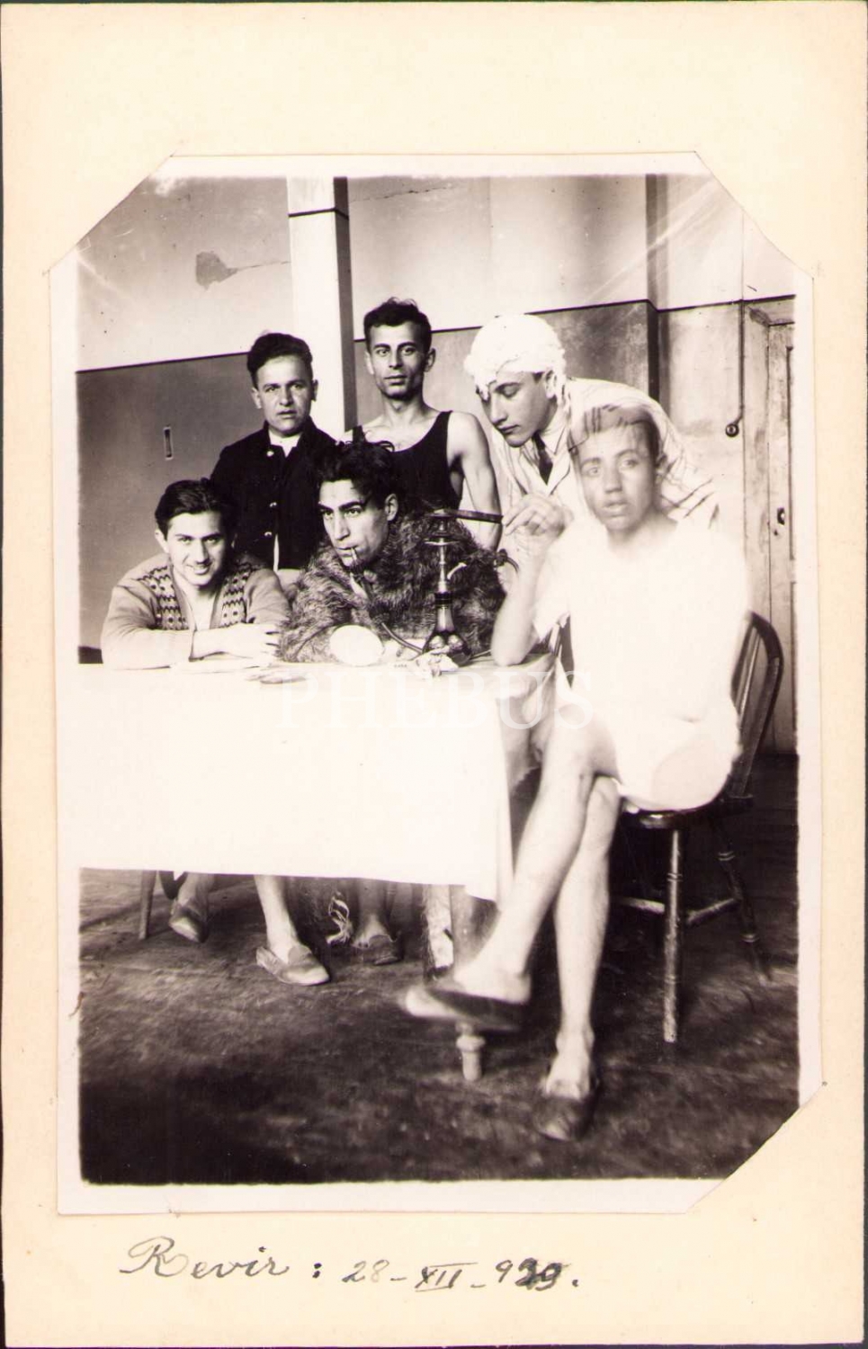 Revirde nargile ile poz veren topluluk hatıra fotoğrafı, 1929 tarihli, kartona iliştirilmiş foto: 8x11 cm