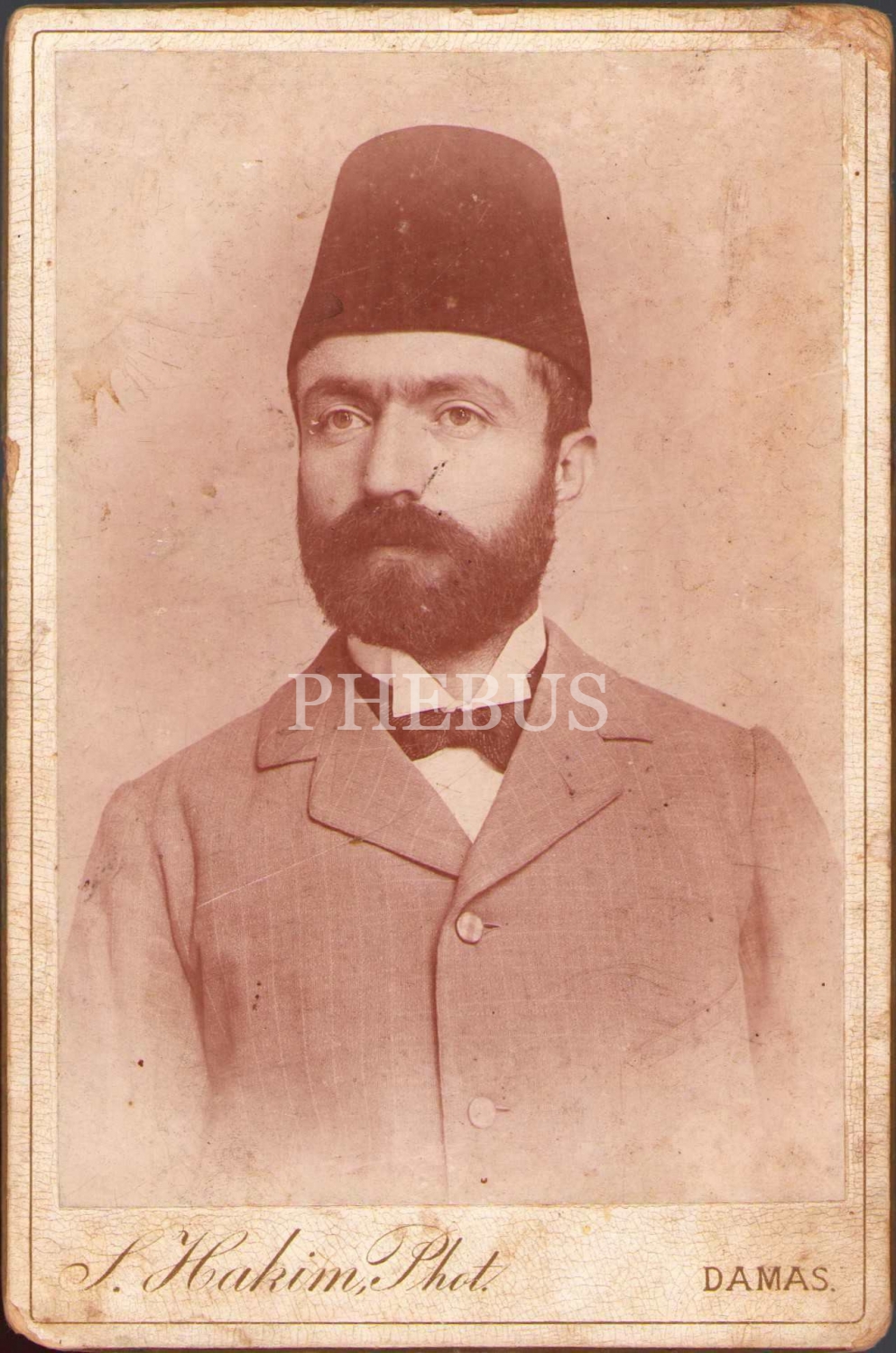 Osmanlı döneminden fesli beyefendi kabin fotoğrafı, S. Hakim Photographie Damas-Suriye, 10x14 cm, yıpranmış haliyle