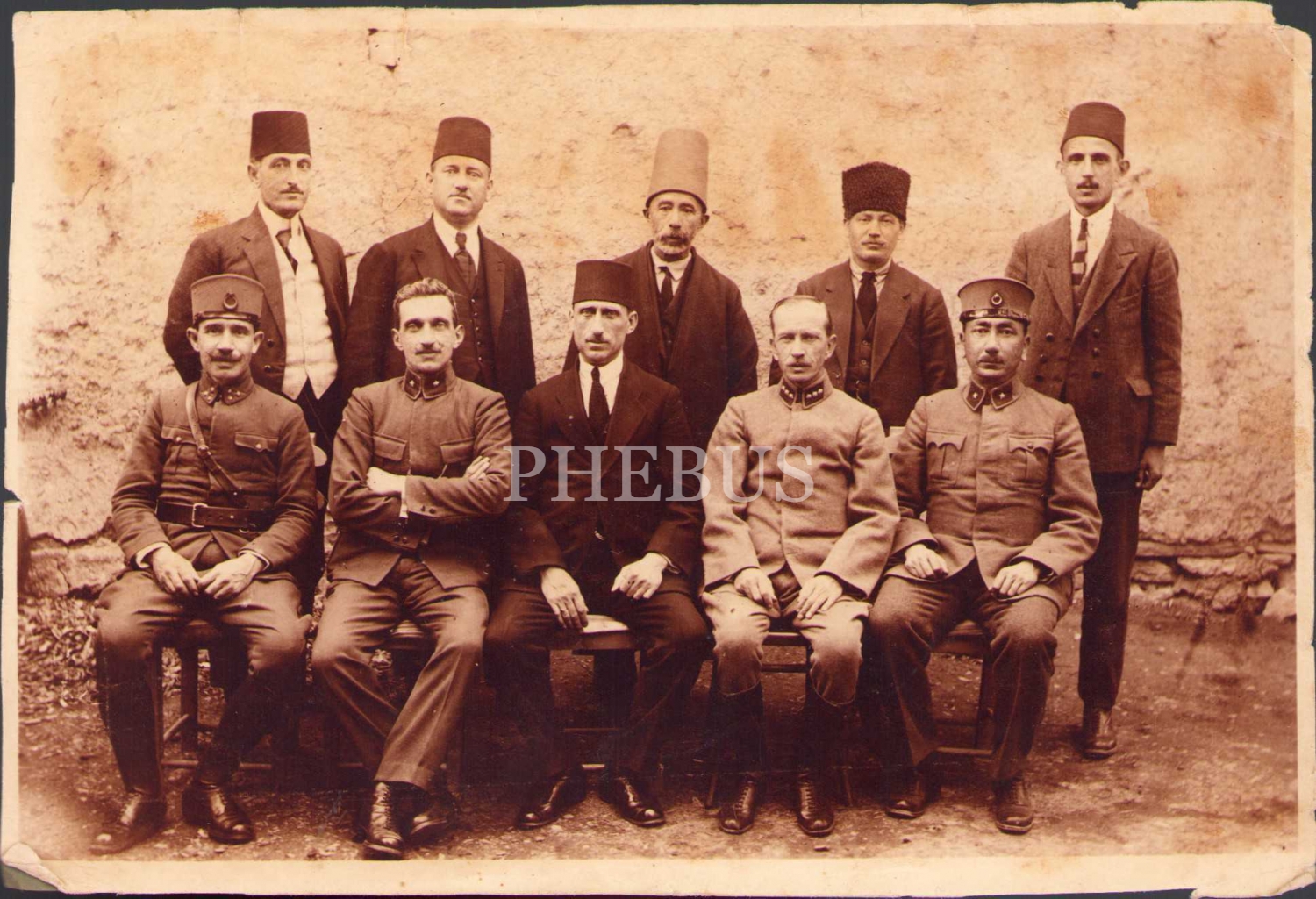Fesli, kalpaklı ve subay üniformalı beylerin toplu hatıra fotoğrafı, aralarında Mevlevi sikkeli bir zat dikkat çekmektedir, 11x16 cm, yıpranmış haliyle