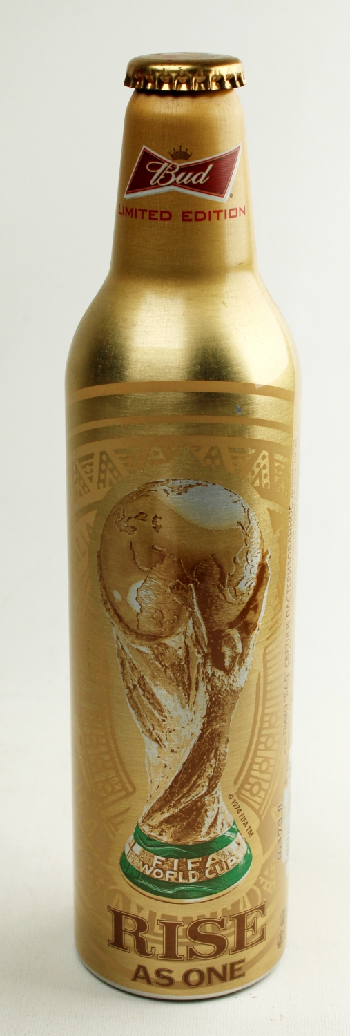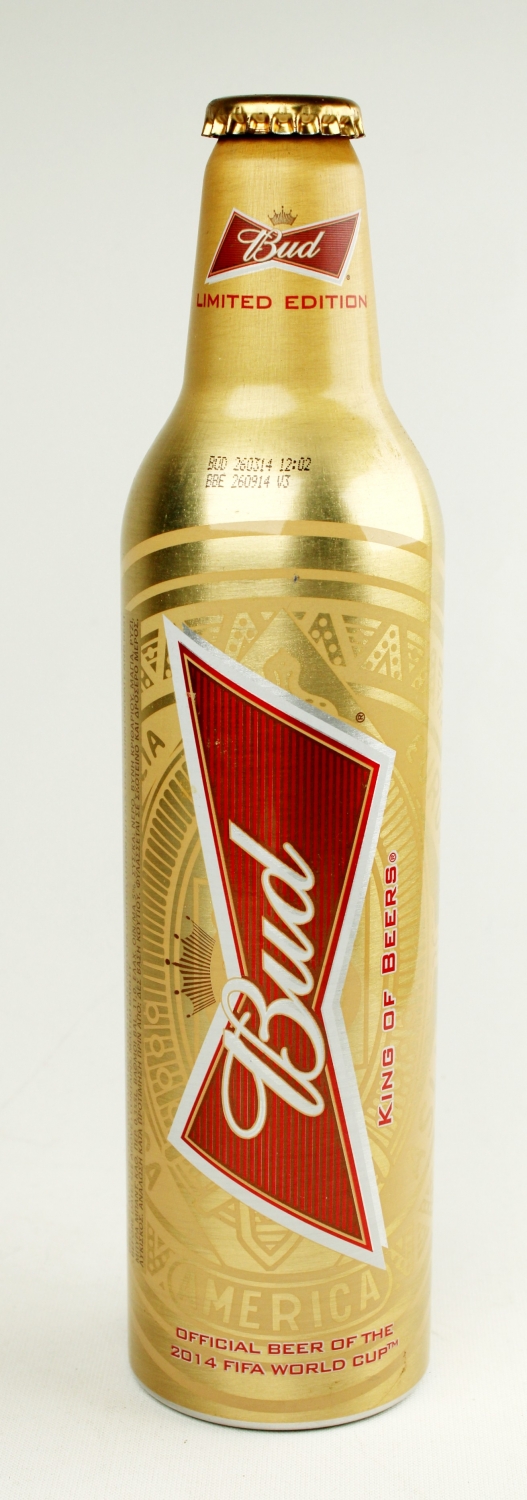 Bud marka bira, teneke şişe, açılmamış, 2014 Fifa World Cup resmi içeceği, 24cm