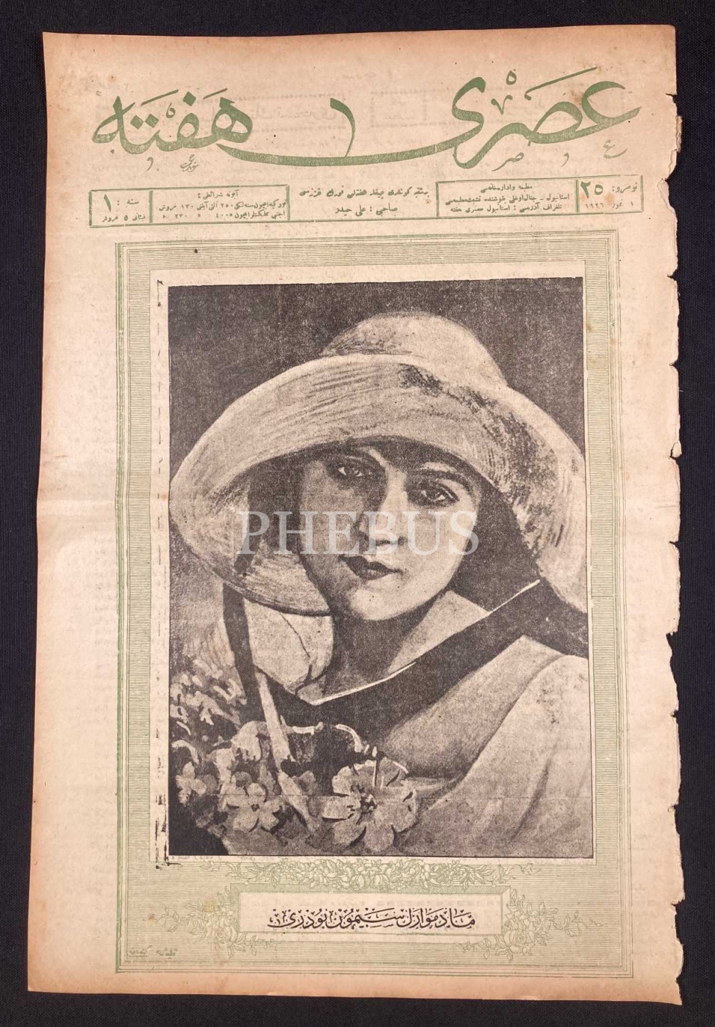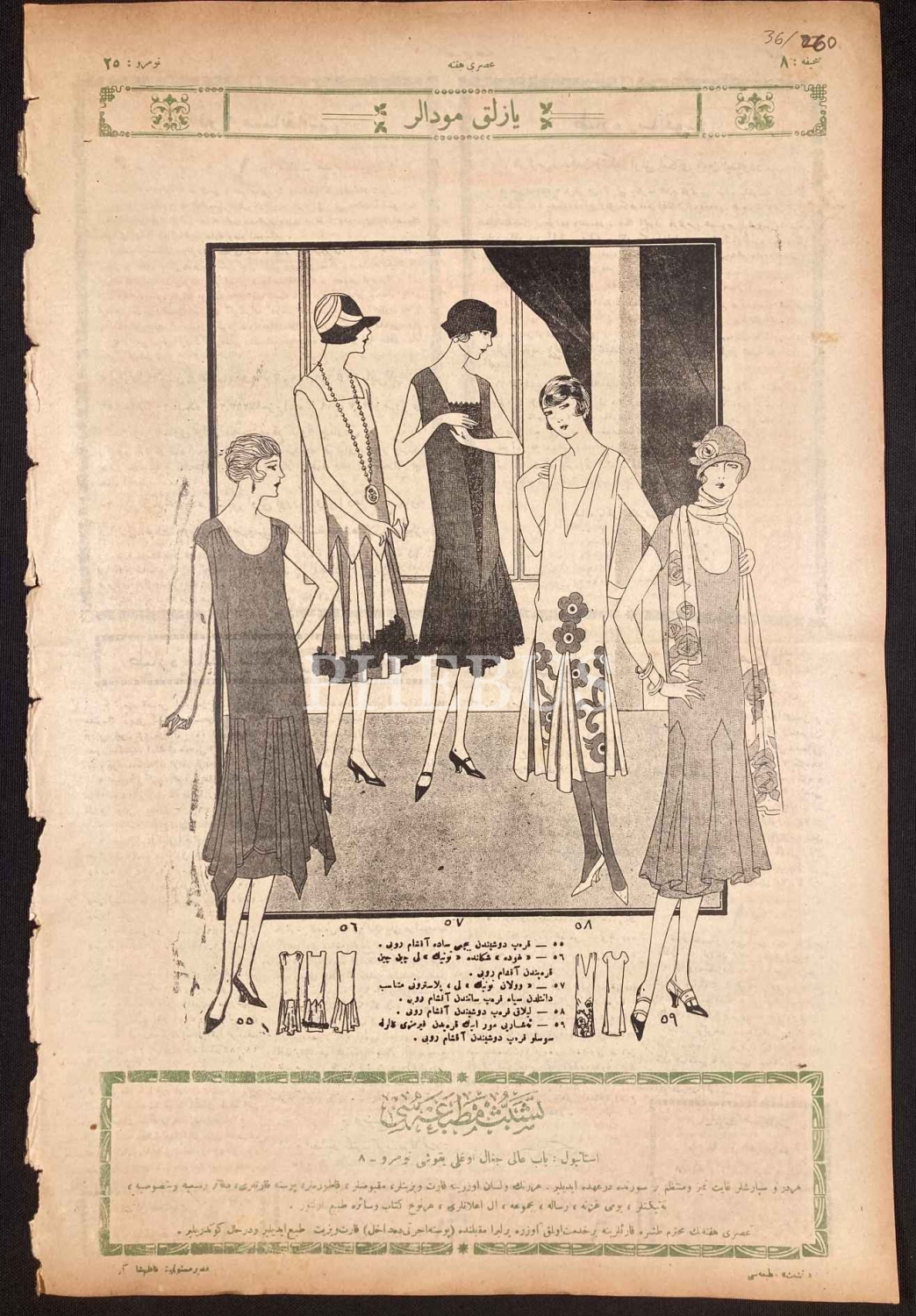 Osmanlıca Asrî Hafta dergisi 25. sayı, 1 Temmuz 1926, "Yazlık Modalar" başlıklı arka kapak görseli ile, 8 sayfa, 30x45 cm, bir kenarı yıpranmış haliyle