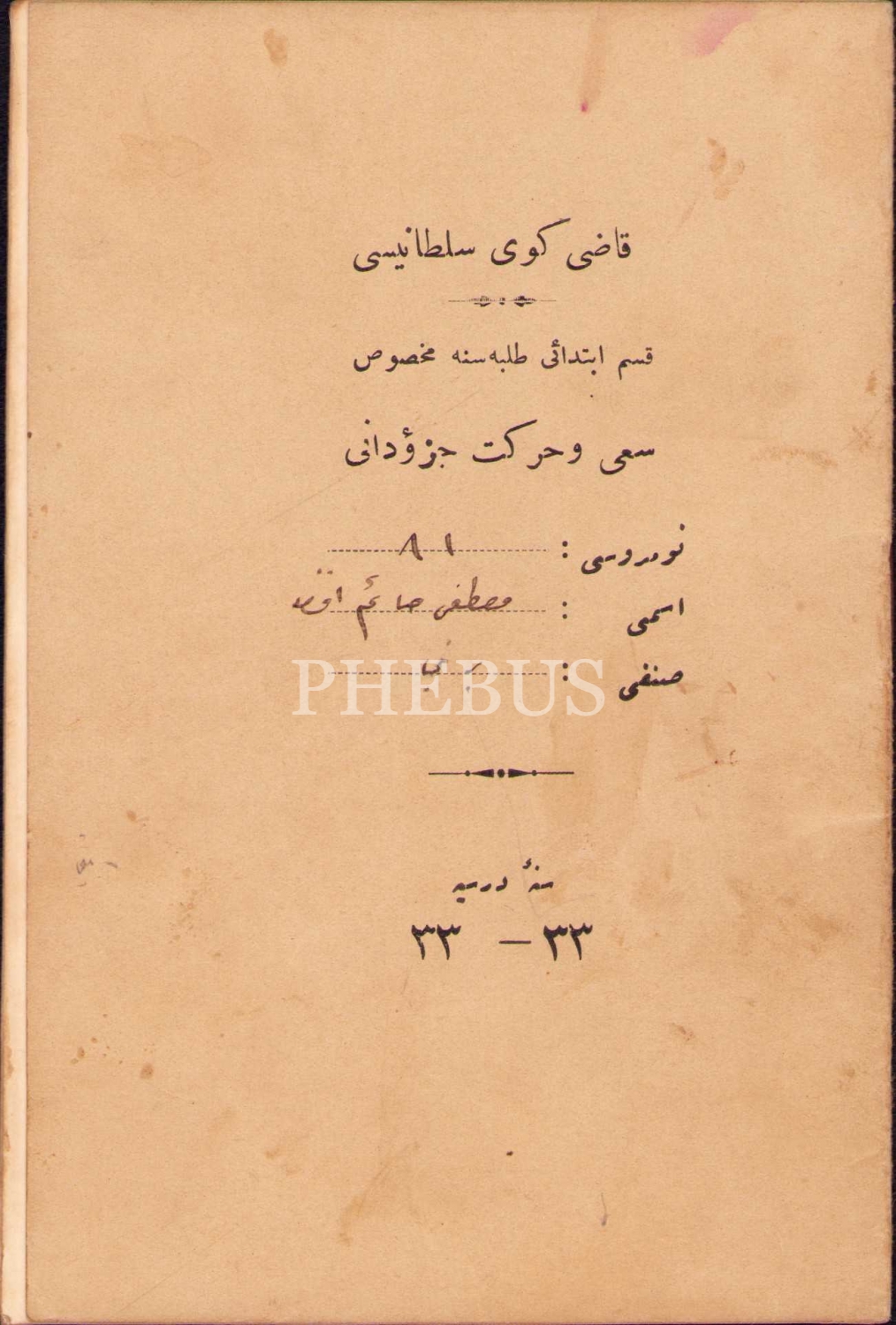 Osmanlıca Kadıköy Sultanisi say ve hareket cüzdanı [öğrenci karnesi], 11x16 cm, kapağı yıpranmış haliyle
