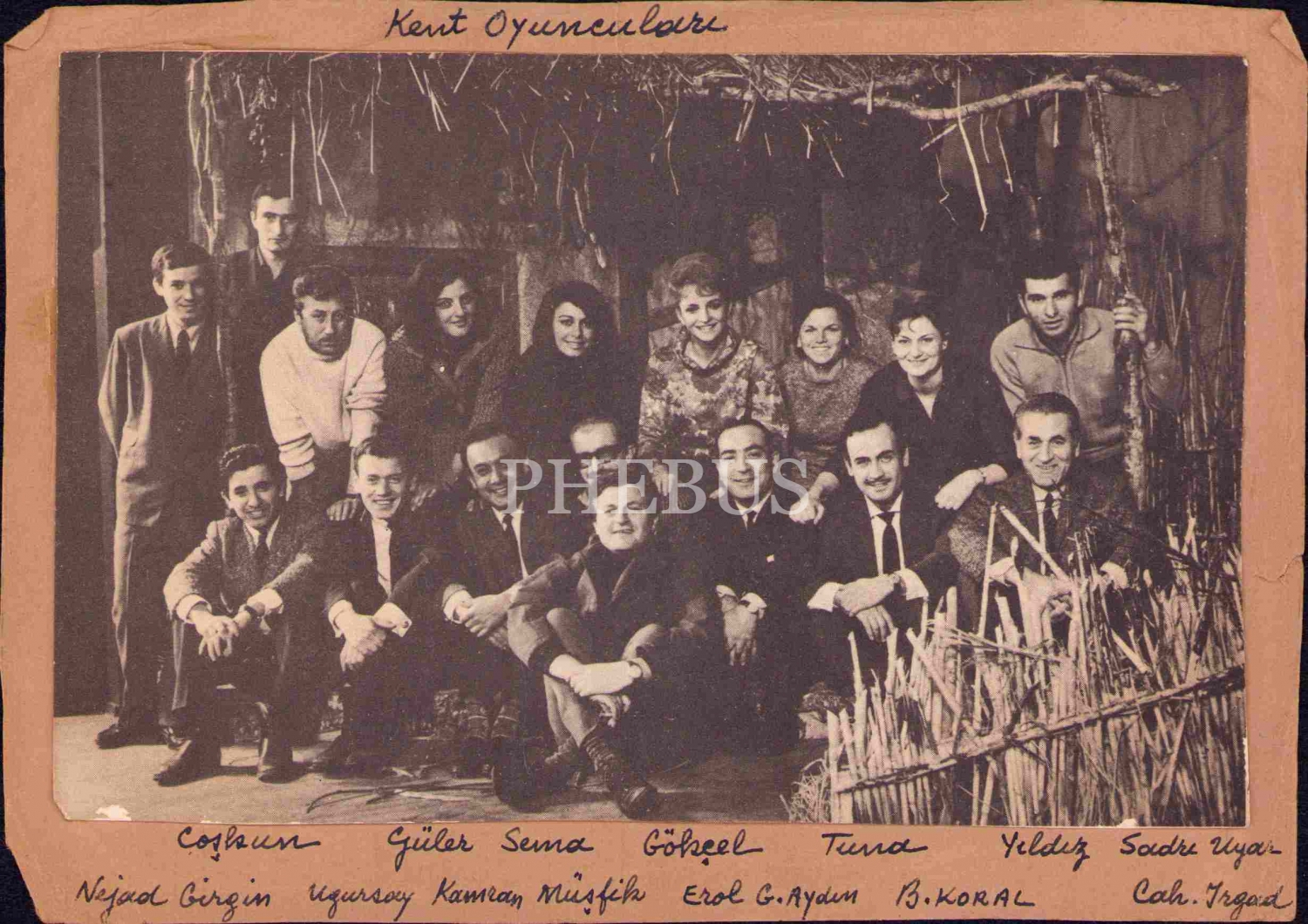 Aralarında Müşfik Kenter, Yıldız Kenter, Erol Günaydın gibi isimlerin yer aldığı "Kent Oyuncuları" baskı hatıra fotoğrafı, kartona yapışık, 12x18 cm, yıpranmış haliyle