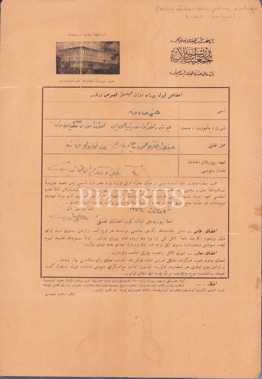 Osmanlıca Darüşşafaka-i İslamiye üyelik kabul belgesi, İstanbul 1336, 22x31 cm, üst kenardan yırtık haliyle