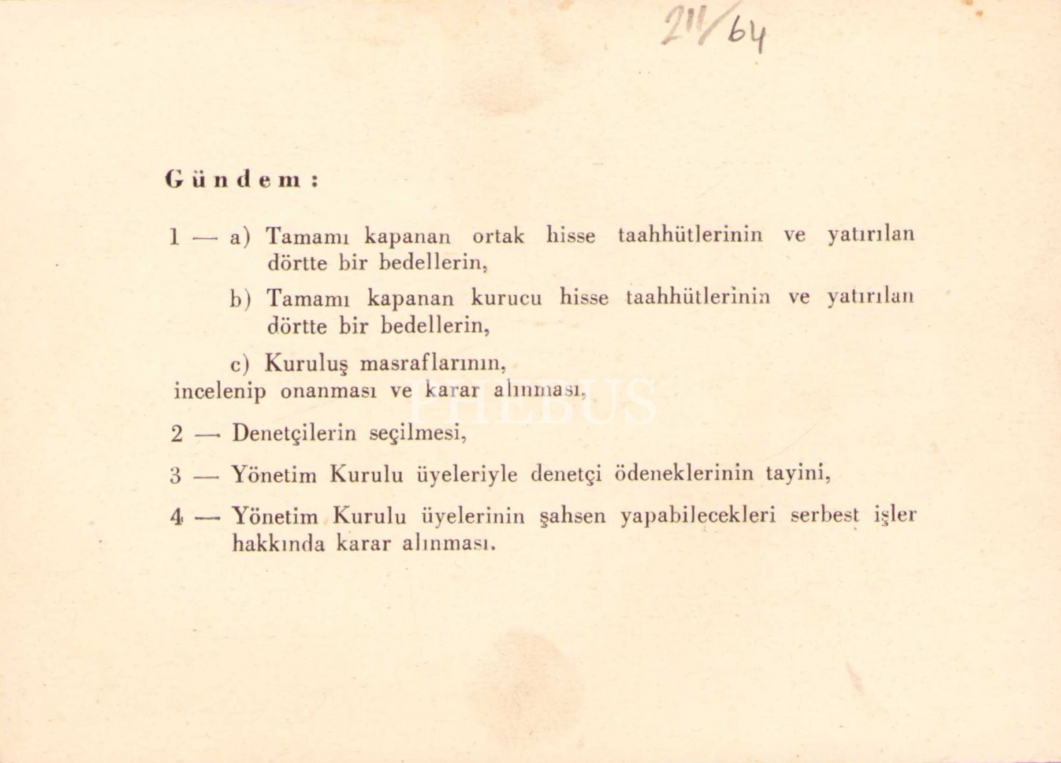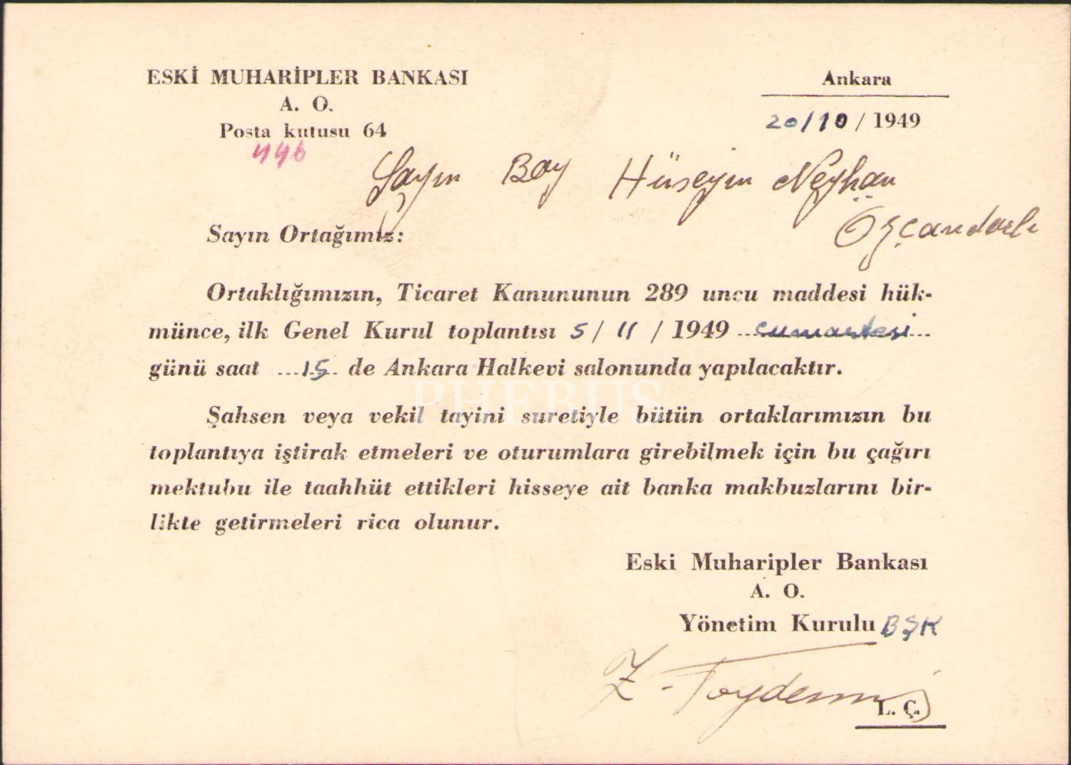 Eski Muharipler Bankası toplantı davetiyesi, Ankara 1949, 11x15 cm
