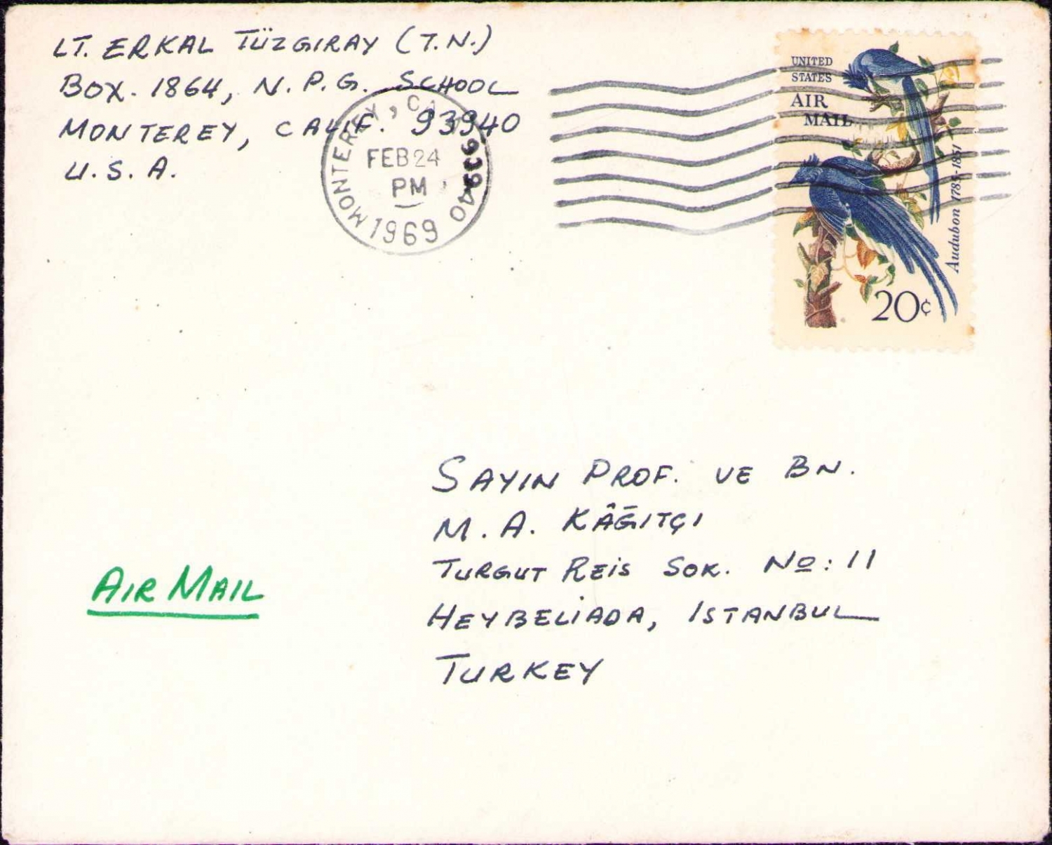 Çevirmen Erkal Tüzgıray'dan Mehmet Ali Kağıtçı'ya hava postası zarfı, 11x13 cm