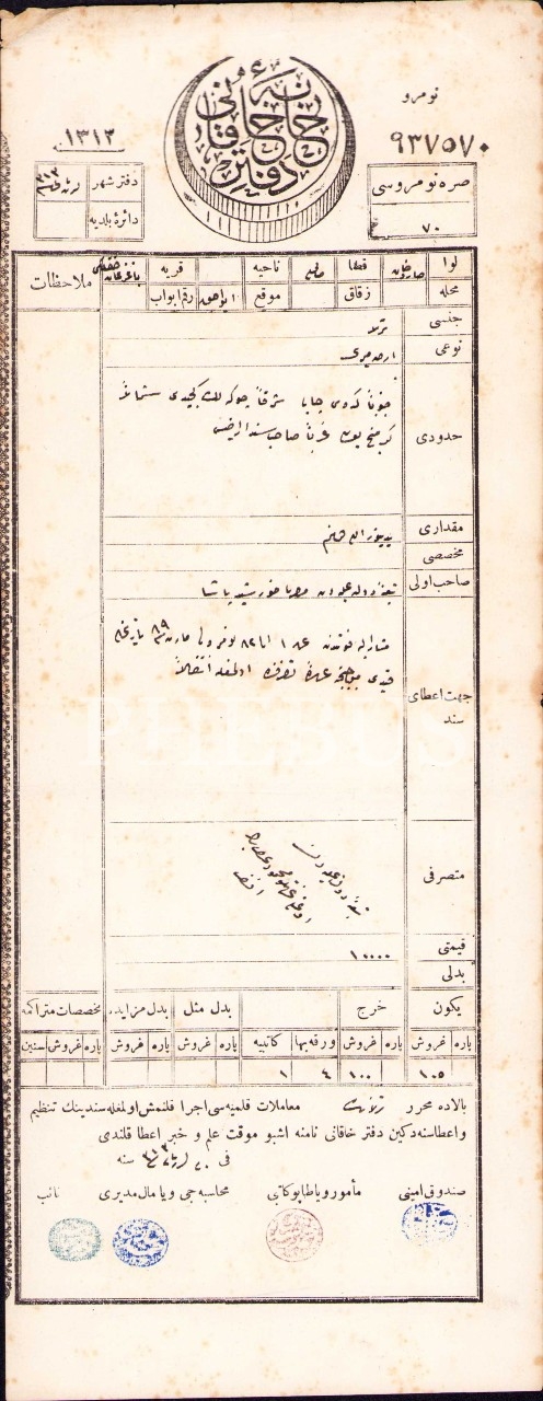 Osmanlıca Defter-i Hakani antetli arz-ı mirî tarla tapusu, Saruhan/Manisa 1313, 13x34 kenarları yıpranmış ve lekeli haliyle