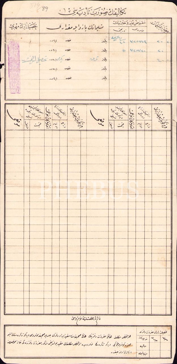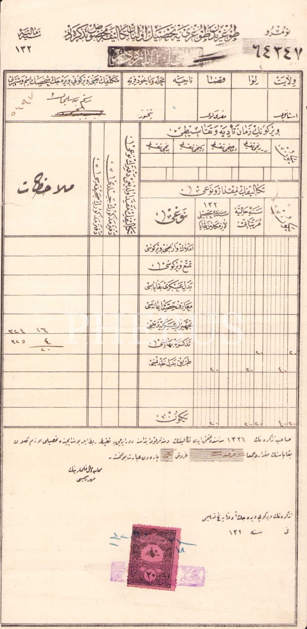Osmanlıca vergi makbuzu, İstanbul 1326, 17x34 cm, epey yıpranmış haliyle