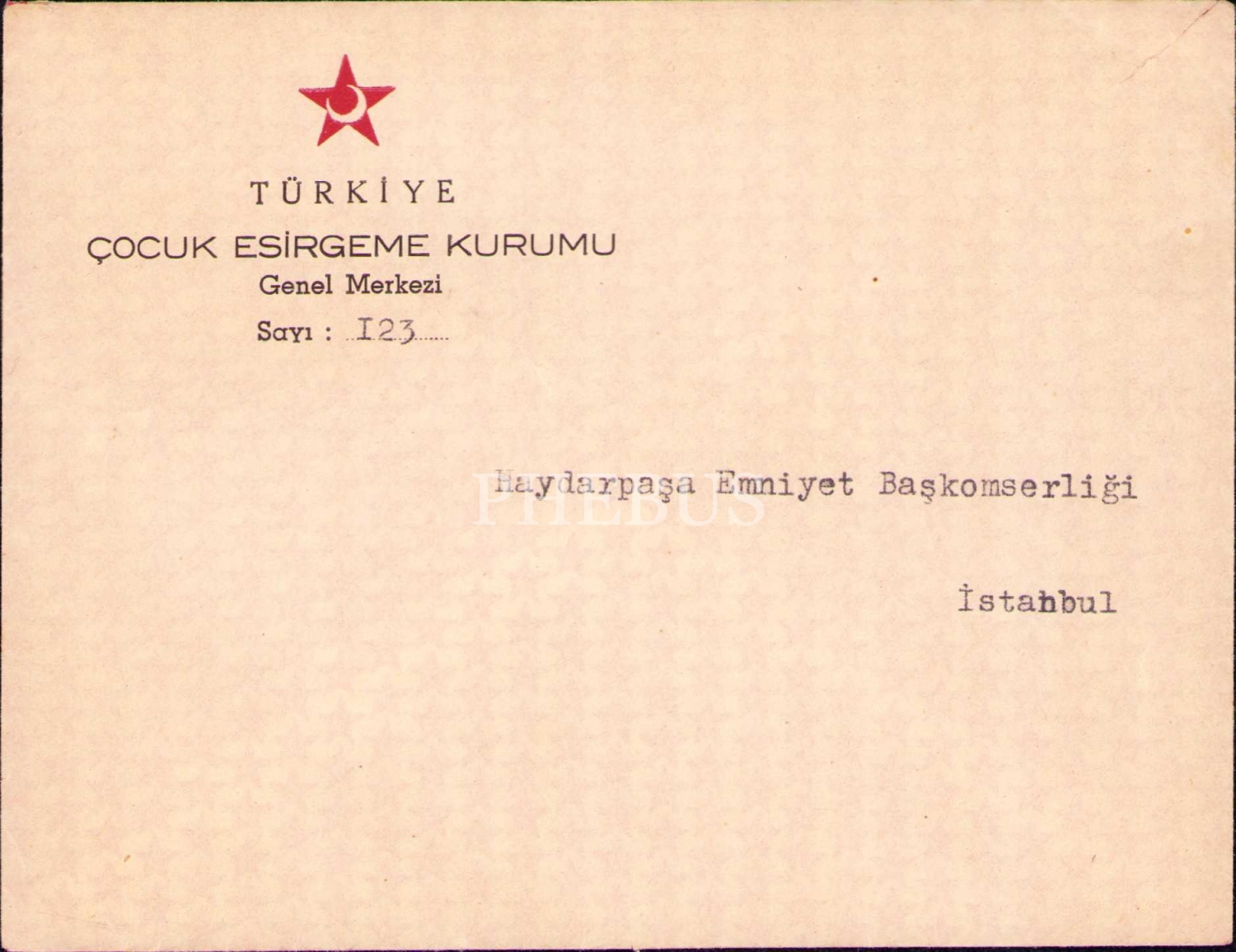 Türkiye Çocuk Esirgeme Kurumu Genel Merkezi'nden Haydarpaşa Emniyet Başkomiserliği'ne gönderilen zarf, 12x16 cm, üst köşesi yırtık haliyle