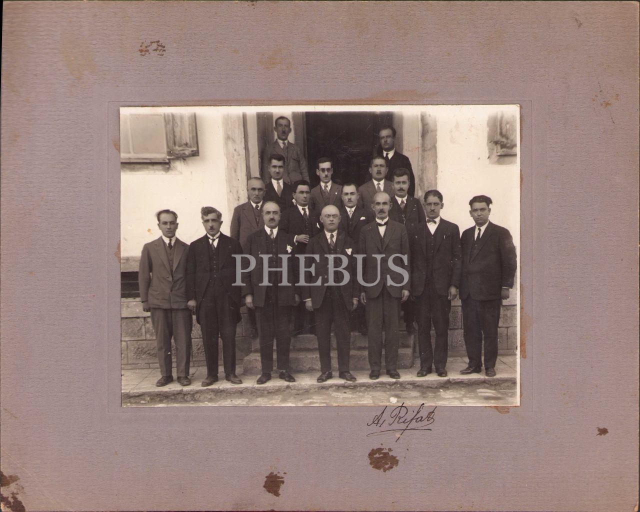 Şık giyimli beyefendilerin toplu hatıra fotoğrafı, foto: 13x17 cm, paspartusu yıpranmış haliyle