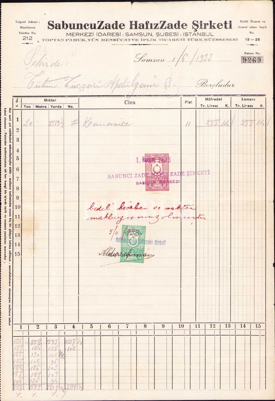 SabuncuZade HafızZade Şirketi Toptan Mensucat ve İplik Ticareti antetli fatura, Samsun-İstanbul 1933, 22x32 cm, yıpranmış haliyle