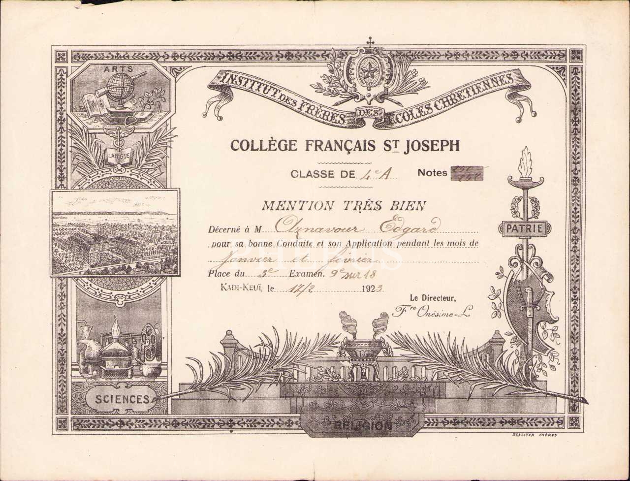Fransızca St. Joseph Koleji onur belgesi, Kadıköy/İstanbul 1923, 20x26 cm, kenarları yıpranmış haliyle