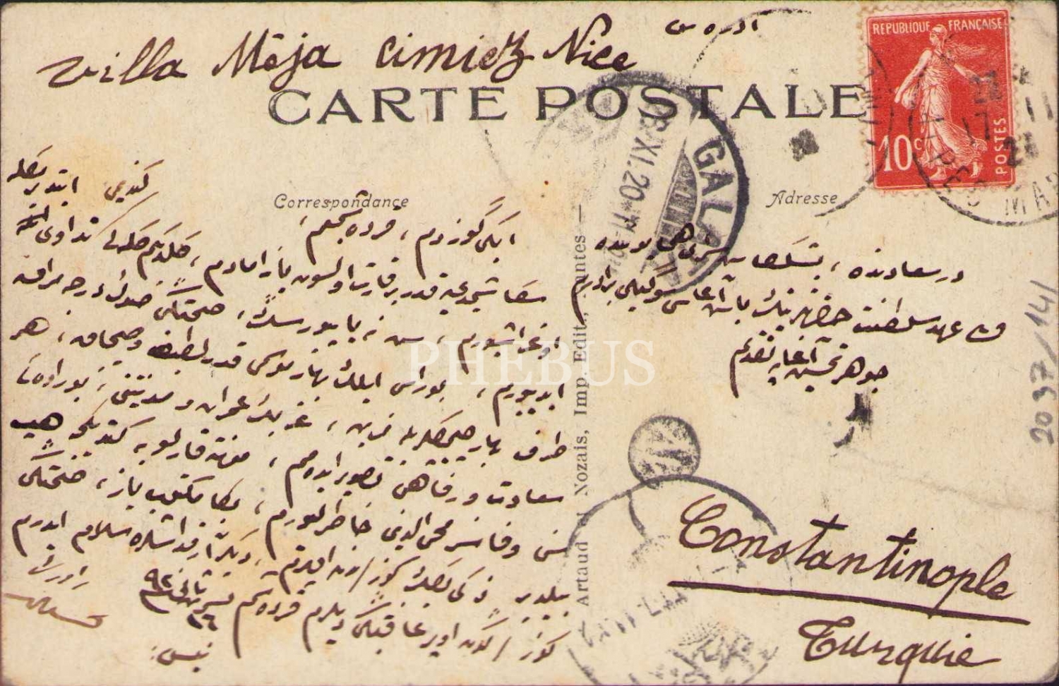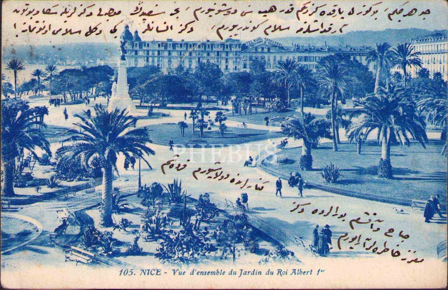 Nice/Fransa'da bir park görselli kart üzerinde Osmanlıca mektup, postadan geçmiş, yıpranmış haliyle