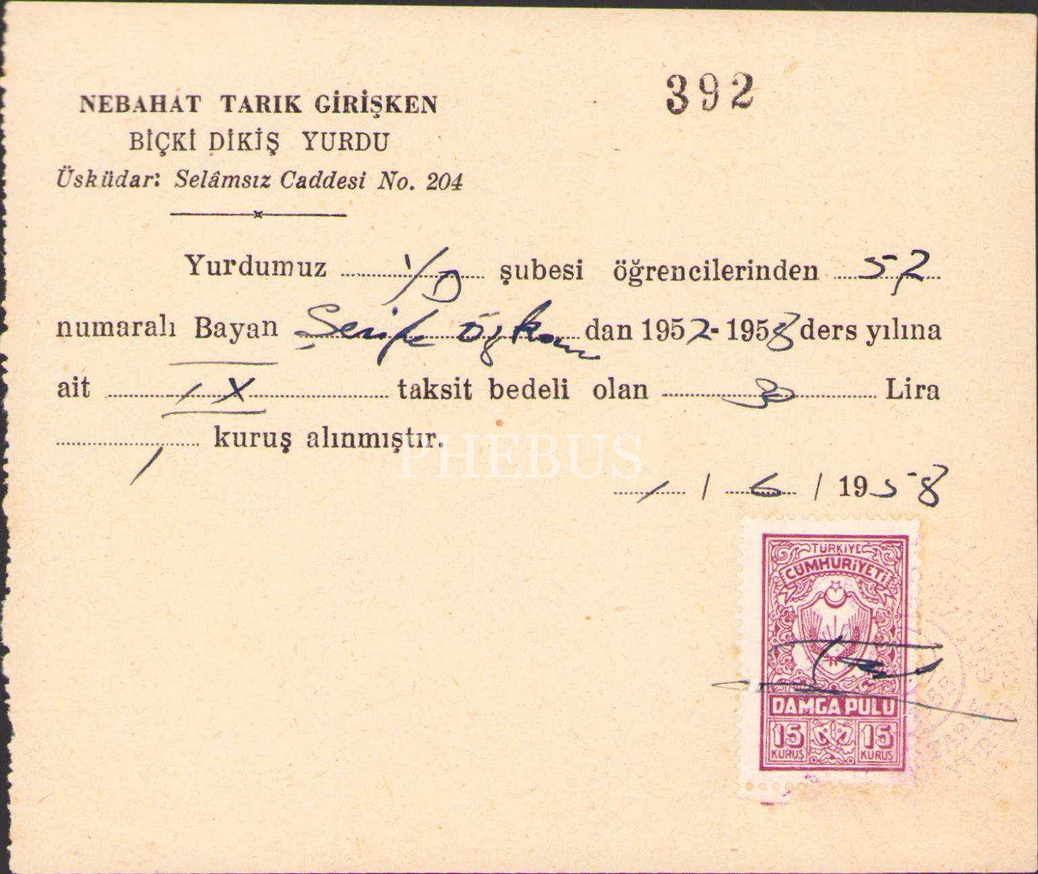 Nebahat Tarık Girişken Biçki Dikiş Yurdu antetli makbuz, 1958 tarihli, 11x13 cm