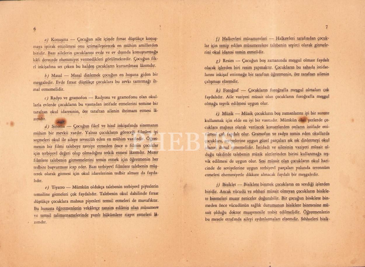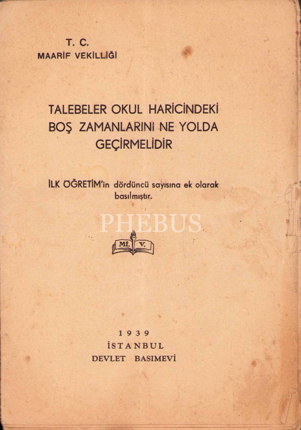 T.C. Maarif Vekilliği'nden öğrencilere: "Talebeler Okul Haricindeki Boş Zamanlarını Ne Yolda Geçirmelidir", Devlet Basımevi, İstanbul 1939, 11 s., 14x20 cm, yıpranmış haliyle