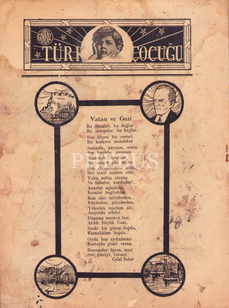 Osmanlıca Gürbüz Türk Çocuğu dergisi 25. sayı, kapakta Celal Sahir'e ait "Vatan ve Gazi" adlı şiir mevcut, 23x30 cm, kapak sayfası yıpranmış haliyle
