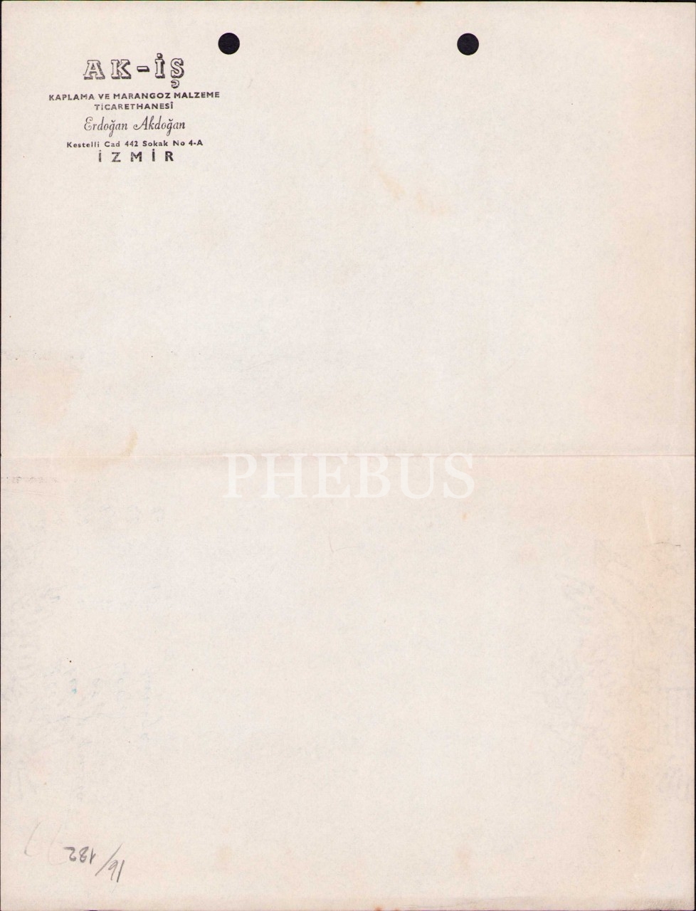 Ak-İş Kaplama ve Marangoz Malzeme Ticarethanesi-İzmir antetli boş kâğıt, 20x27 cm, yorgun haliyle
