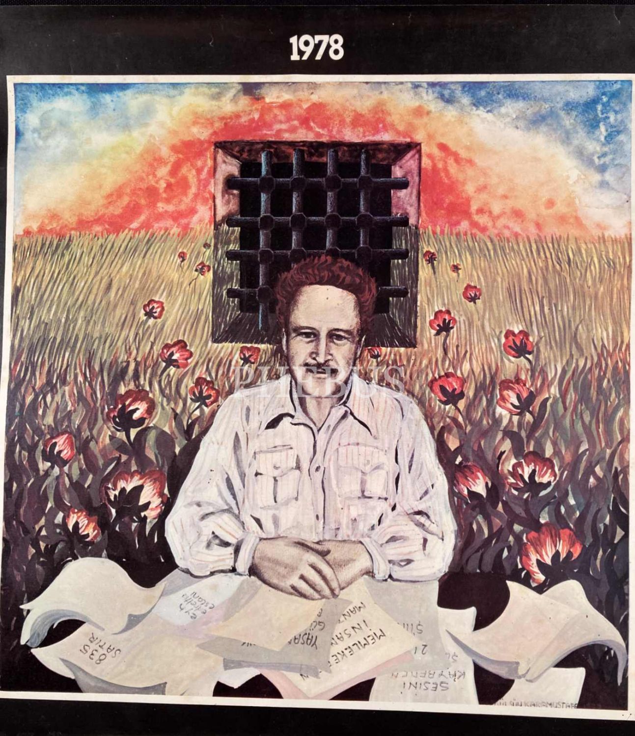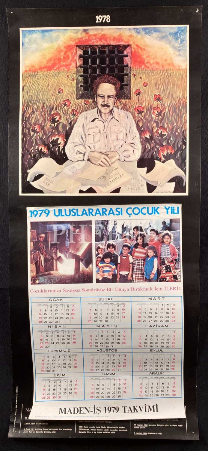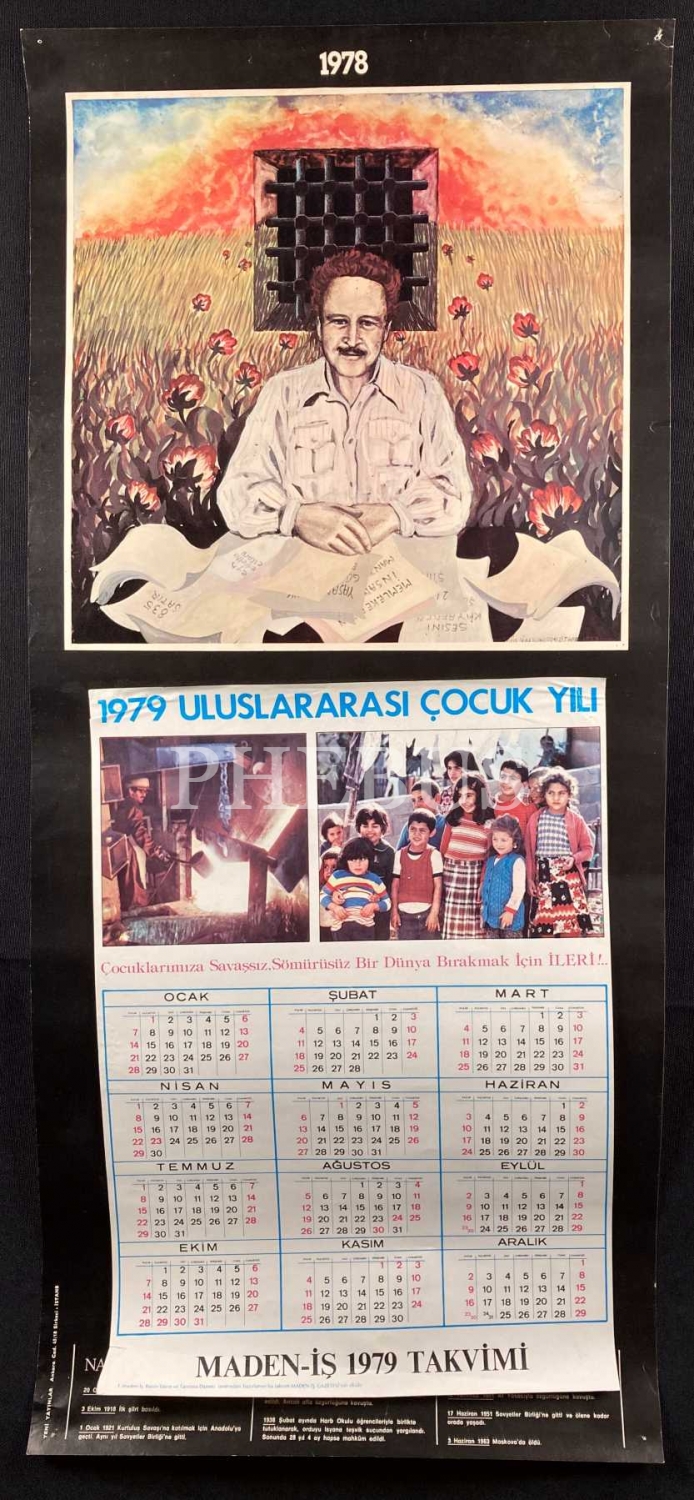 Maden-İş 1978-79 yılına ait, Nazım Hikmet görselli takvim, 30x68 cm, köşeleri yıpranmış haliyle