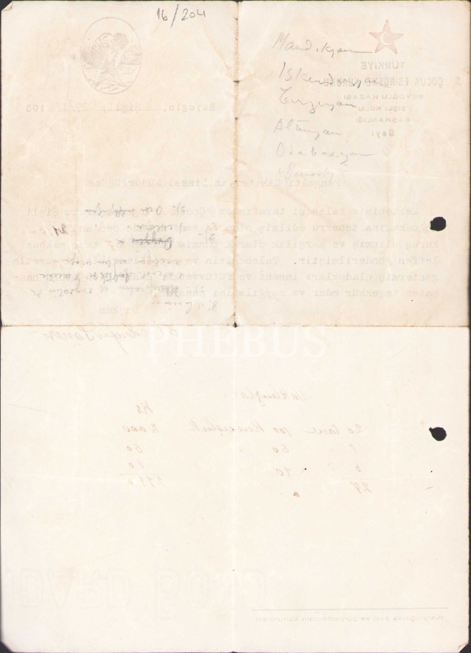 Türkiye Çocuk Esirgeme Kurumu'ndan Pangaltı Mıhıtaryan Lisesi Müdürlüğü'ne dilekçe, Beyoğlu 1935, 18x25 cm, yıpranmış haliyle