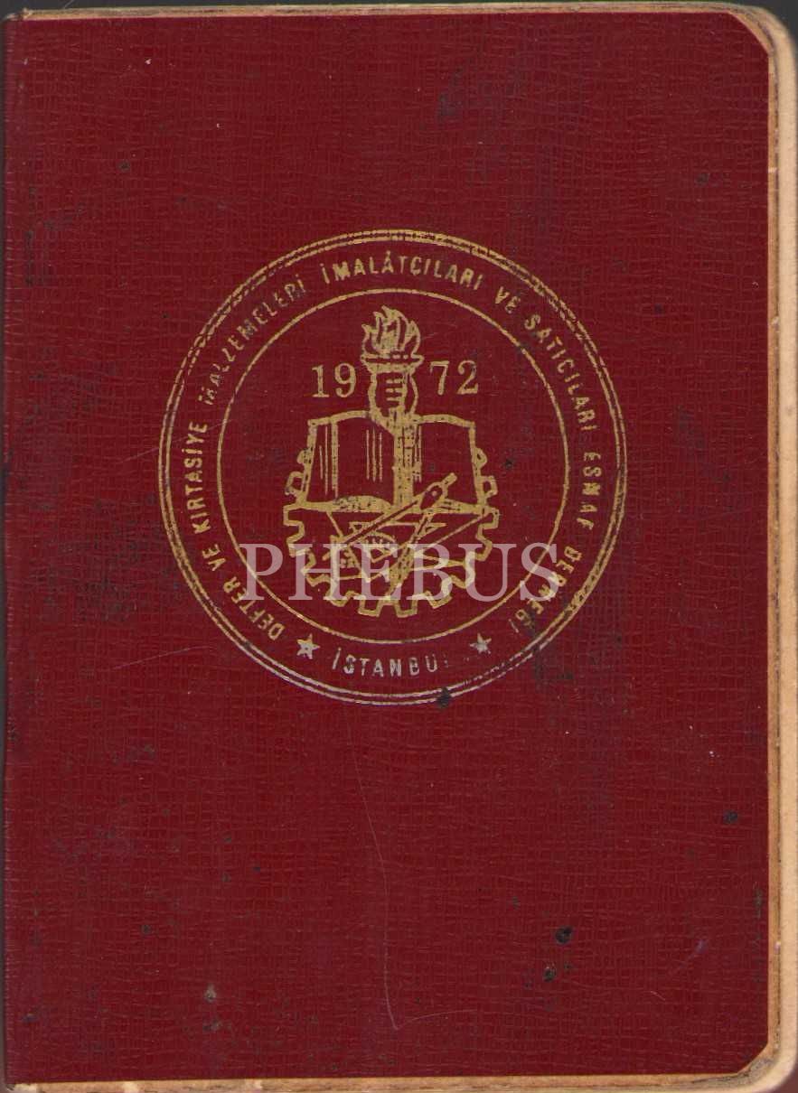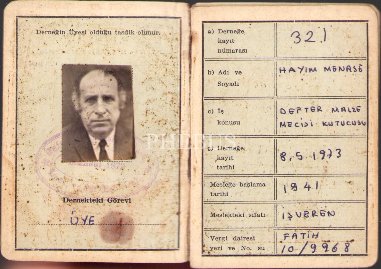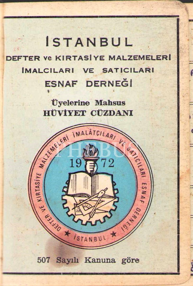 İstanbul Defter ve Kırtasiye Malzemeleri Esnaf Derneği üyelerine mahsus fotoğraflı kimlik, Musevi Hayım Menase'ye ait, 7x10 cm, yıpranmış haliyle