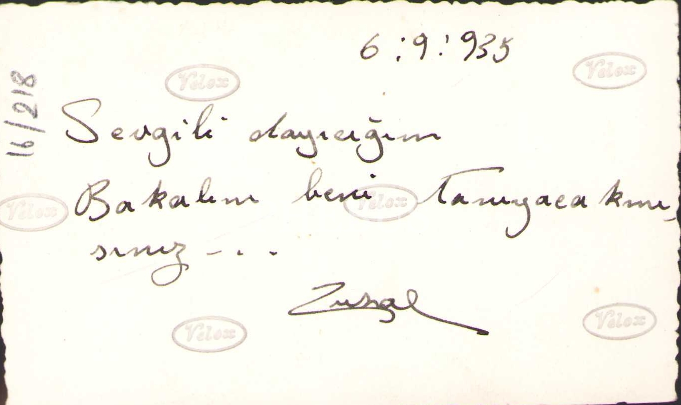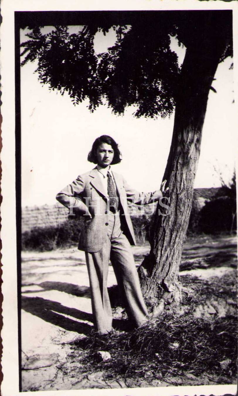 Takım elbiseli genç kız fotoğrafı, 1935 tarihli, arkası yazılı, 7x12 cm