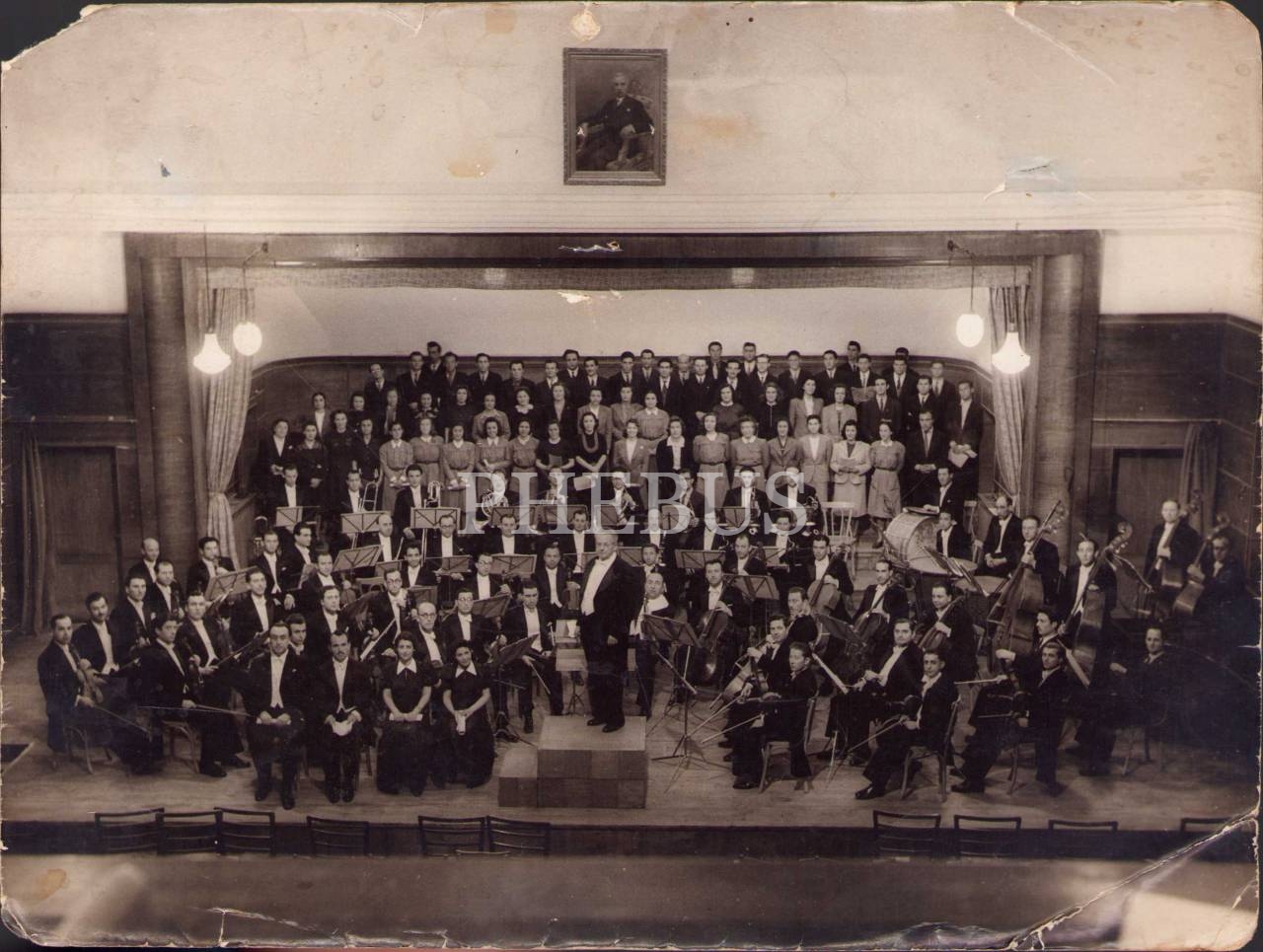 Alman Orkestra Şefi Ernst Praetorius Yönetiminde Cumhurbaşkanlığı Senfoni Orkestrası, İsmet İnönü portresinin asılı olduğu salonda, 18x24 cm, epey yıpranmış haliyle
