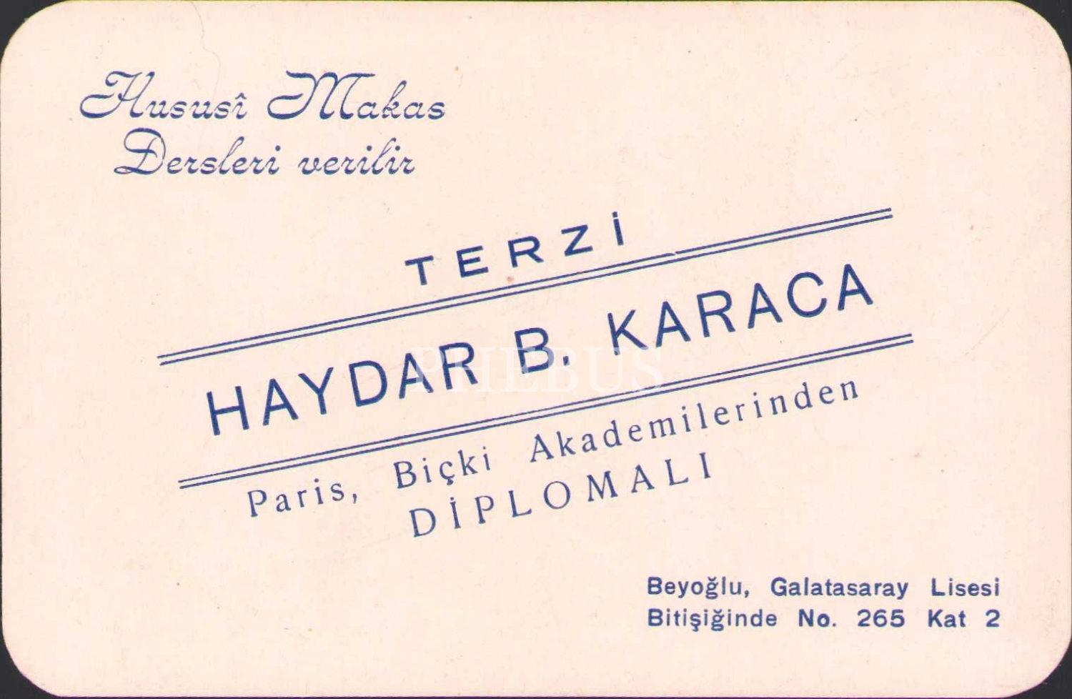 Terzi Haydar B. Karaca reklam kartı, Beyoğlu/İstanbul, 8x13 cm