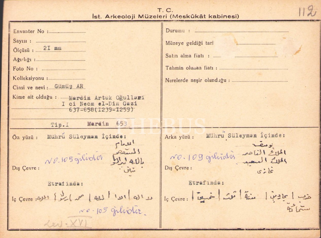 Mardin Artukoğulları döneminden bir gümüş sikkeye ait bilgidir.