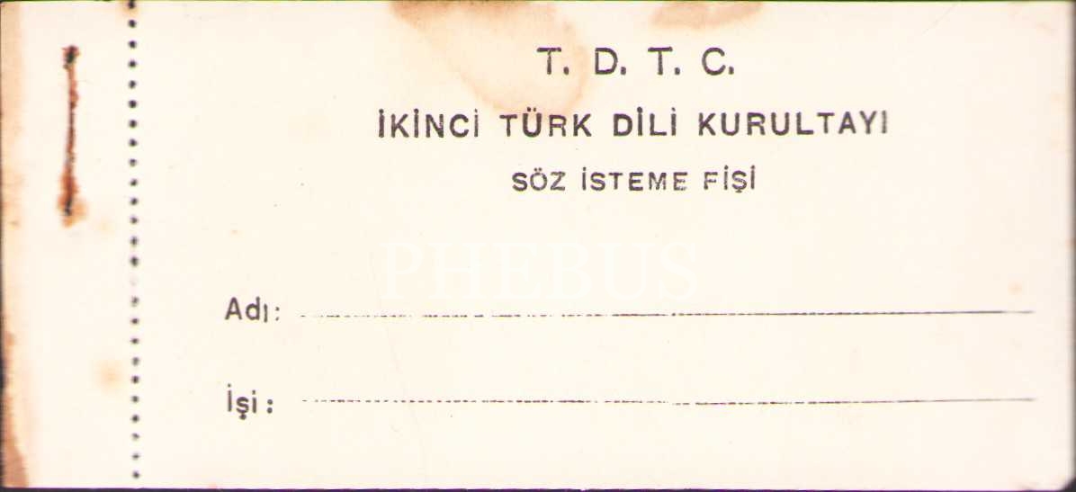 T.D.T.C. İkinci Türk Dili Kurultayı [boş] söz isteme fişi, 5x10 cm, su almış haliyle