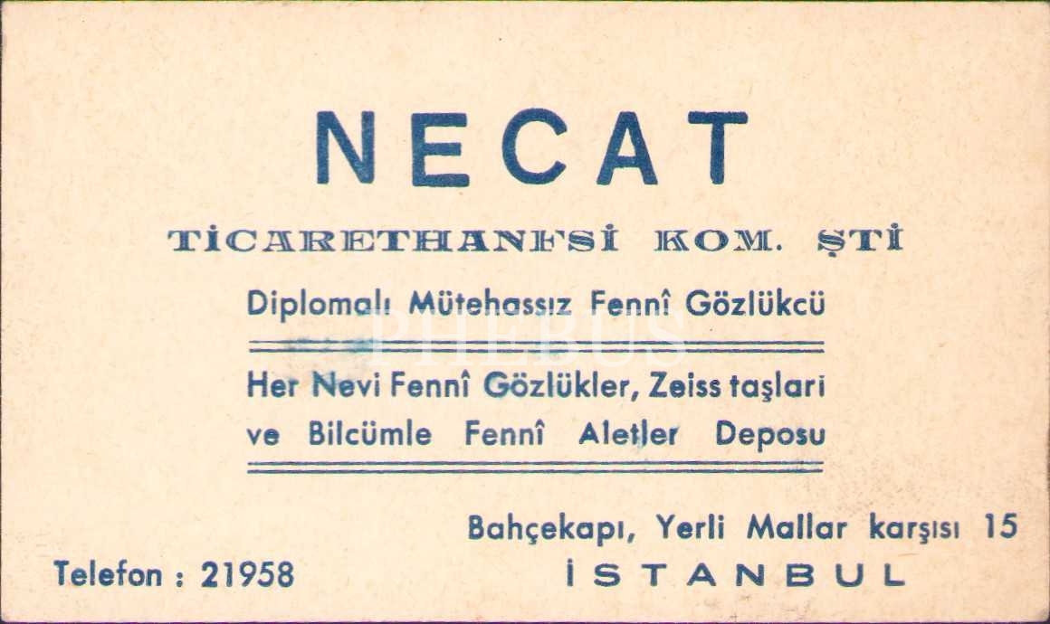 Necat Ticarethanesi-Fennî Gözlükçü reklam kartı, İstanbul, 6x10 cm, yorgun haliyle