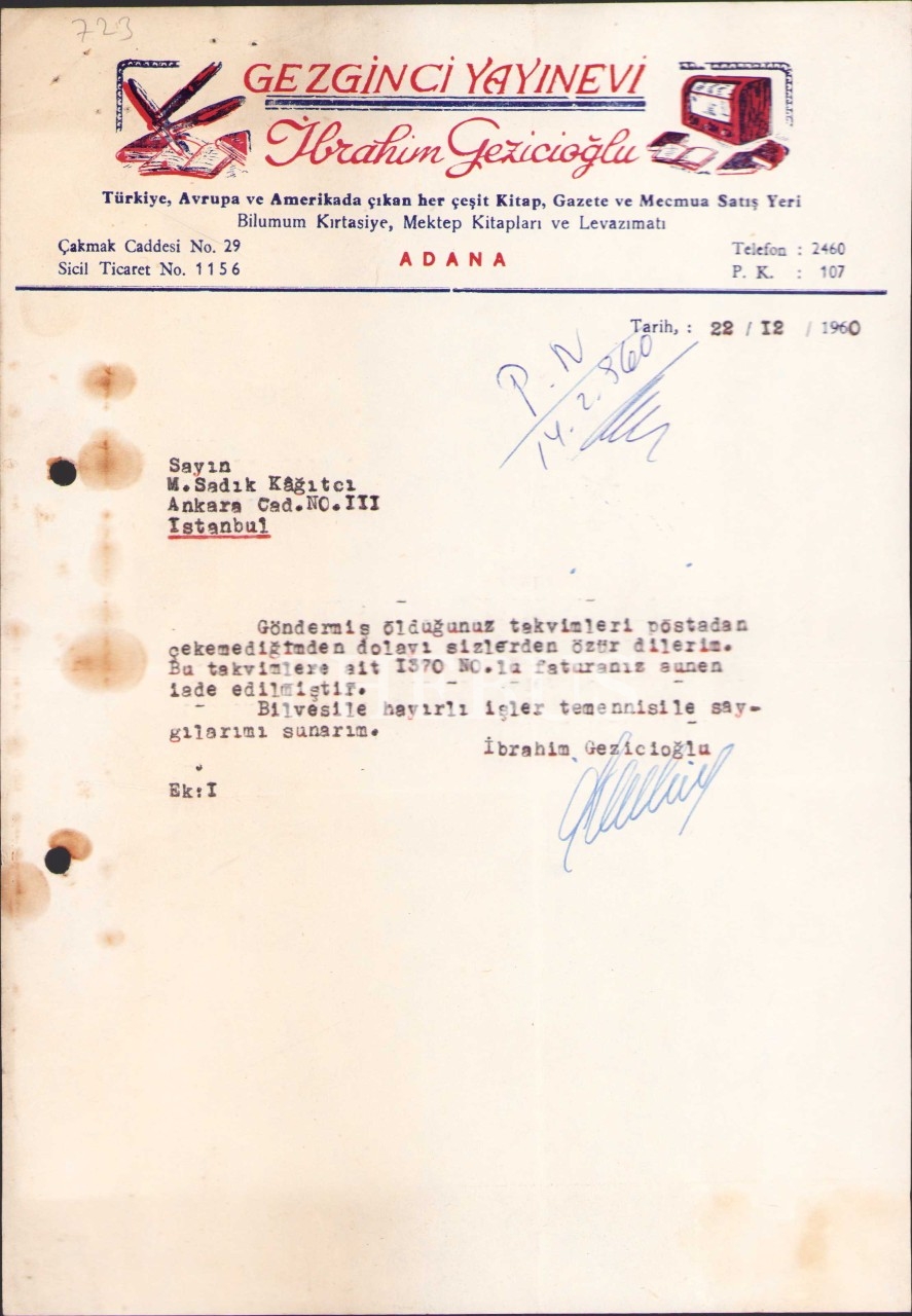 Gezginci Yayınevi-Adana antetli kâğıtta mektup, 1960 tarihli, 19x27 cm, hafif yıpranmış haliyle