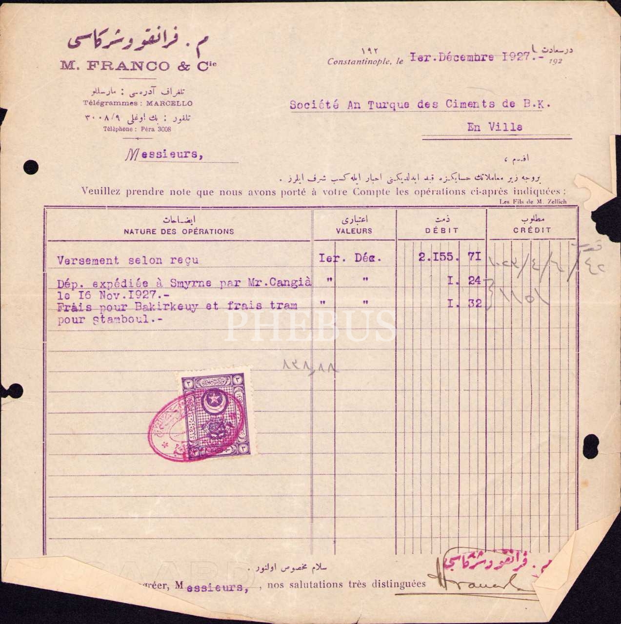 Osmanlıca-Fransızca M. Franco ve Şürekası antetli fatura, Constantinople 1927, 22x22 cm, yıpranmış haliyle