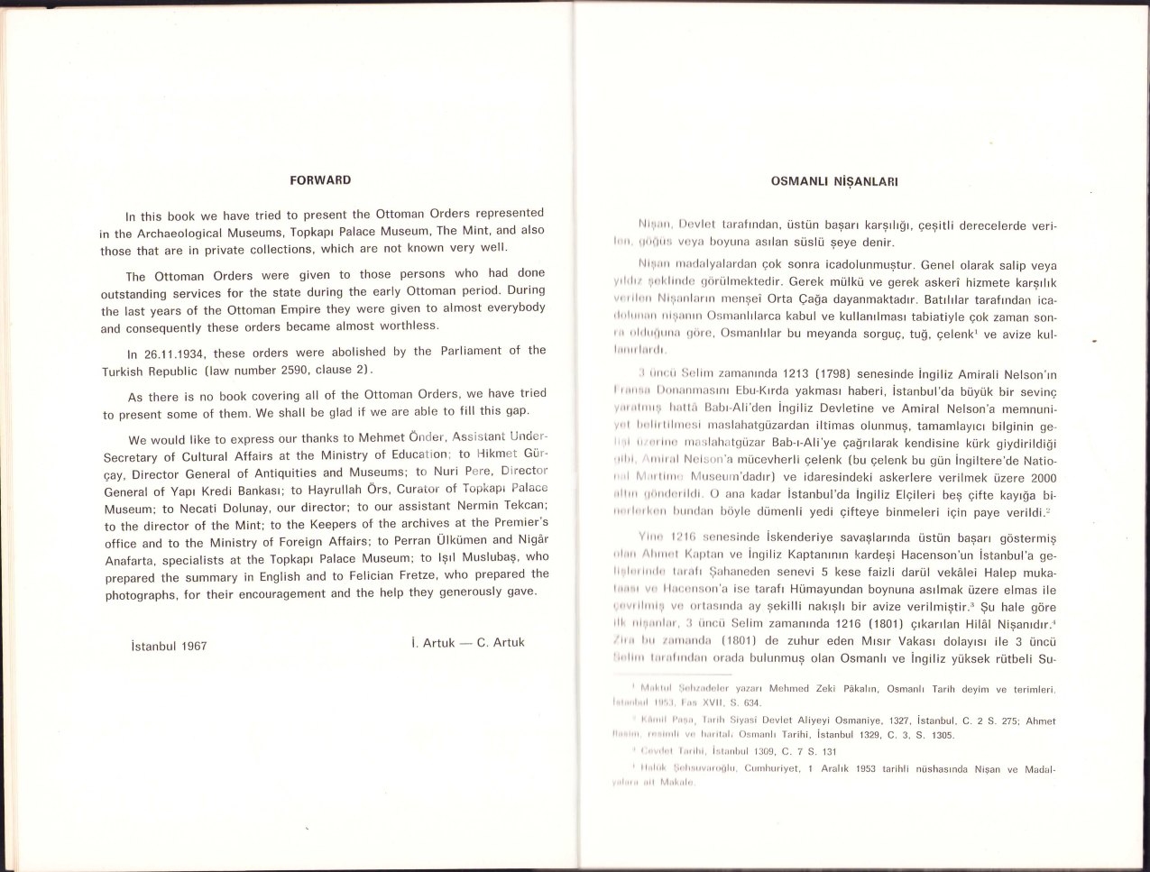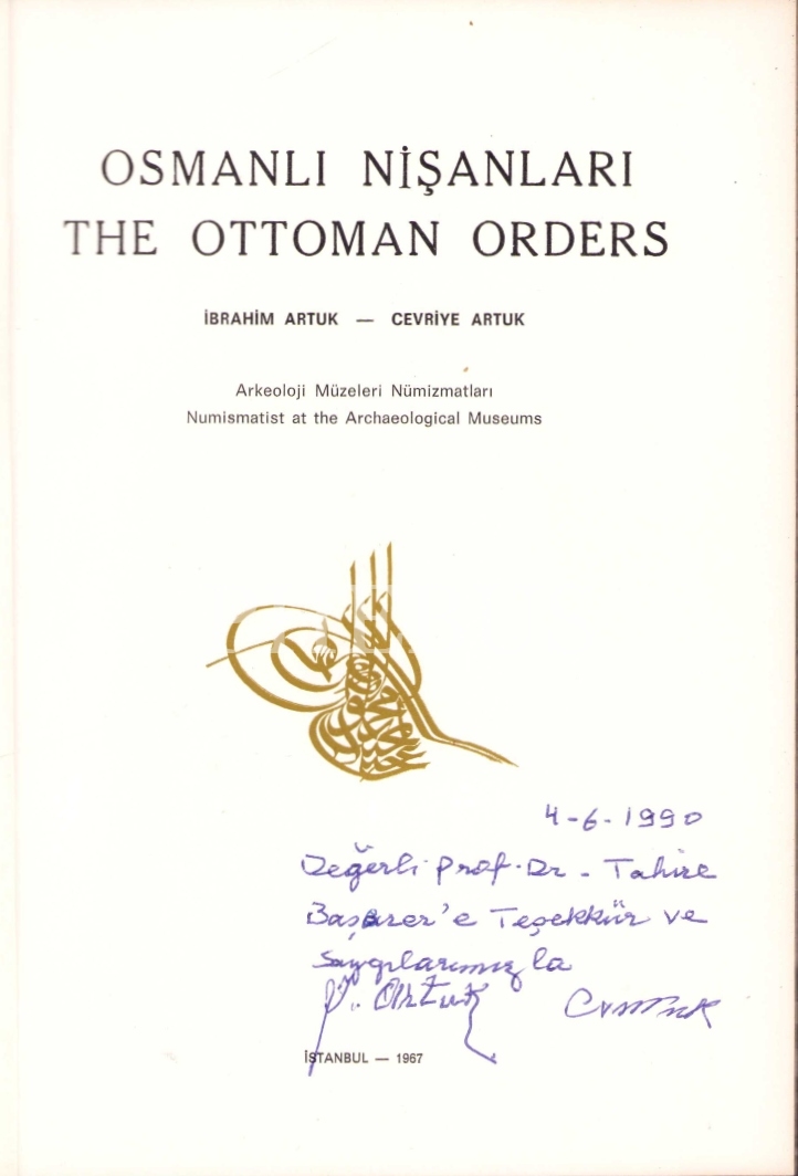 Osmanlı Nişanları, İbrahim-Cevriye Artuk, yazarlarından ithaf ve imzalı, İstanbul Matbaası, İstanbul 1967, 51 s., 16x23 cm, kapağı yorgun haliyle