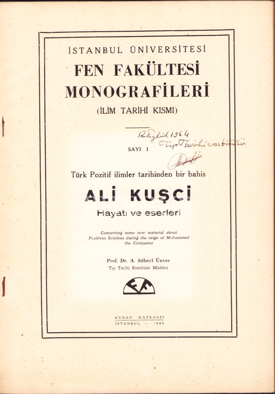 Ali Kuşci Hayatı ve Eserleri, A. Süheyl Ünver, Kenan Matbaası, İstanbul 1948, 89 s., 20x29 cm, kapak ve künye sayfası yıpranmış haliyle