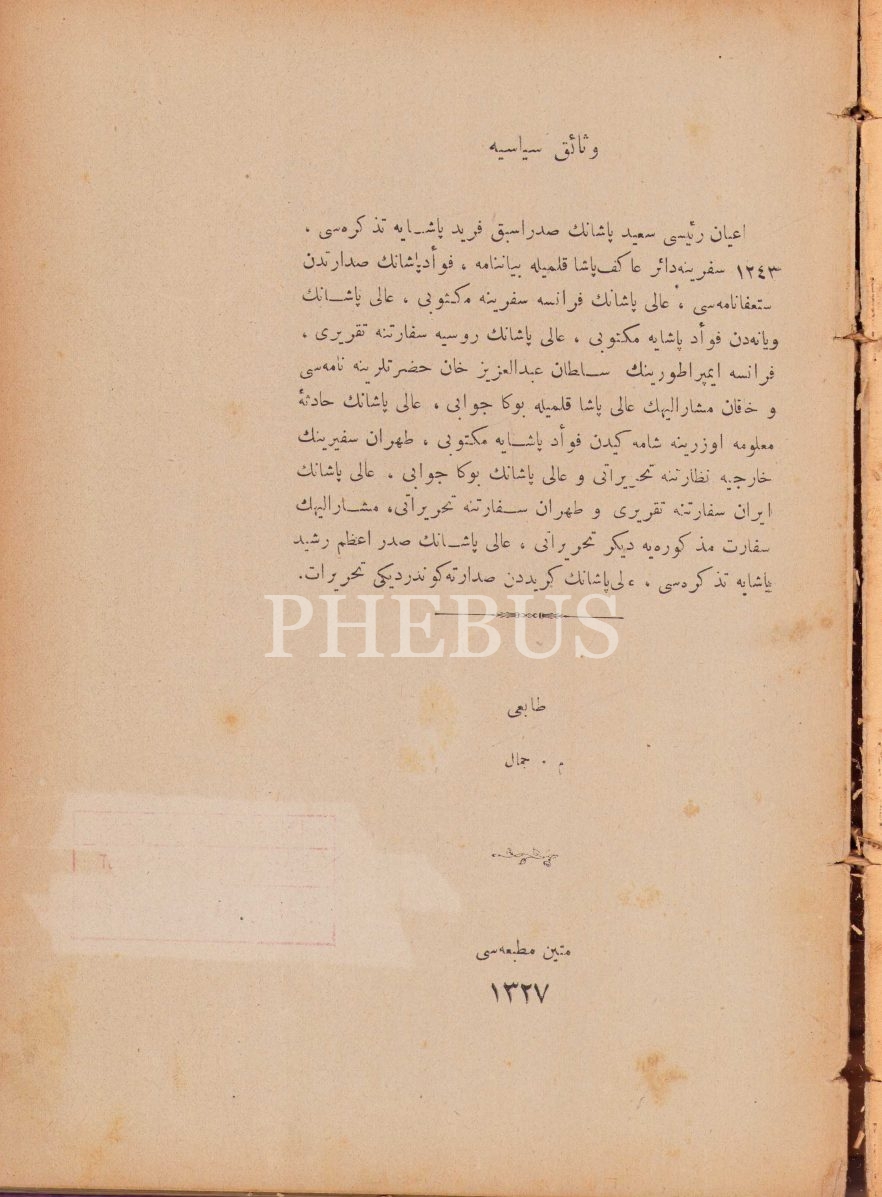 Osmanlıca Vatan Müdâfilerine (Risâle), 93 s.; Vesâik-i Siyâsiyye, Metin Matbaası, 1327, 68 s., 18x26 cm, sırtı ve cildi yıpranmış haliyle