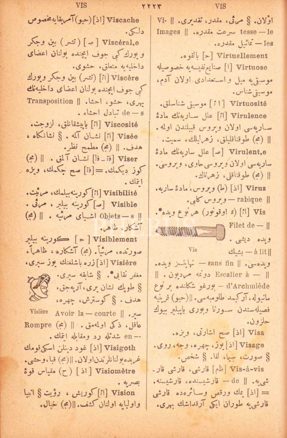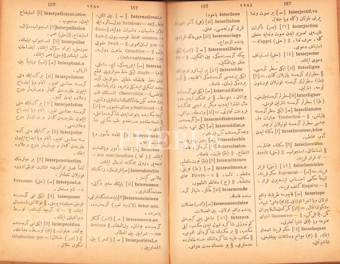 Osmanlıca Resimli Kamûs-ı Fransevî (Fransızcadan Türkçeye Lügat Kitabı), Şemseddin Sâmi, Mihran Matbaası, İstanbul 1901, 2240 s., 13x19 cm, künye sayfası yırtık haliyle