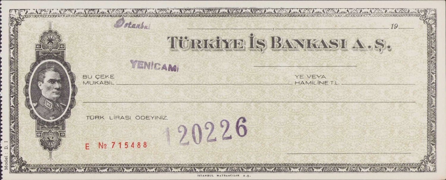 Türkiye İş Bankası İstanbul Yenicami Şubesi çek yaprağı, Atatürk görselli, 22x9cm