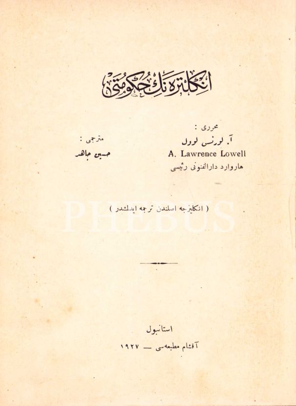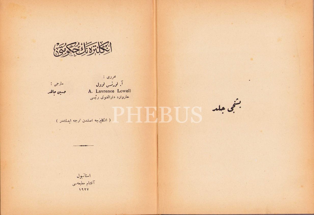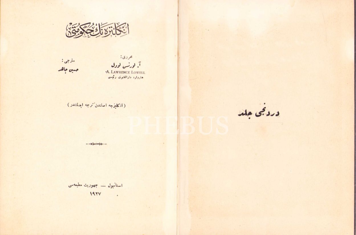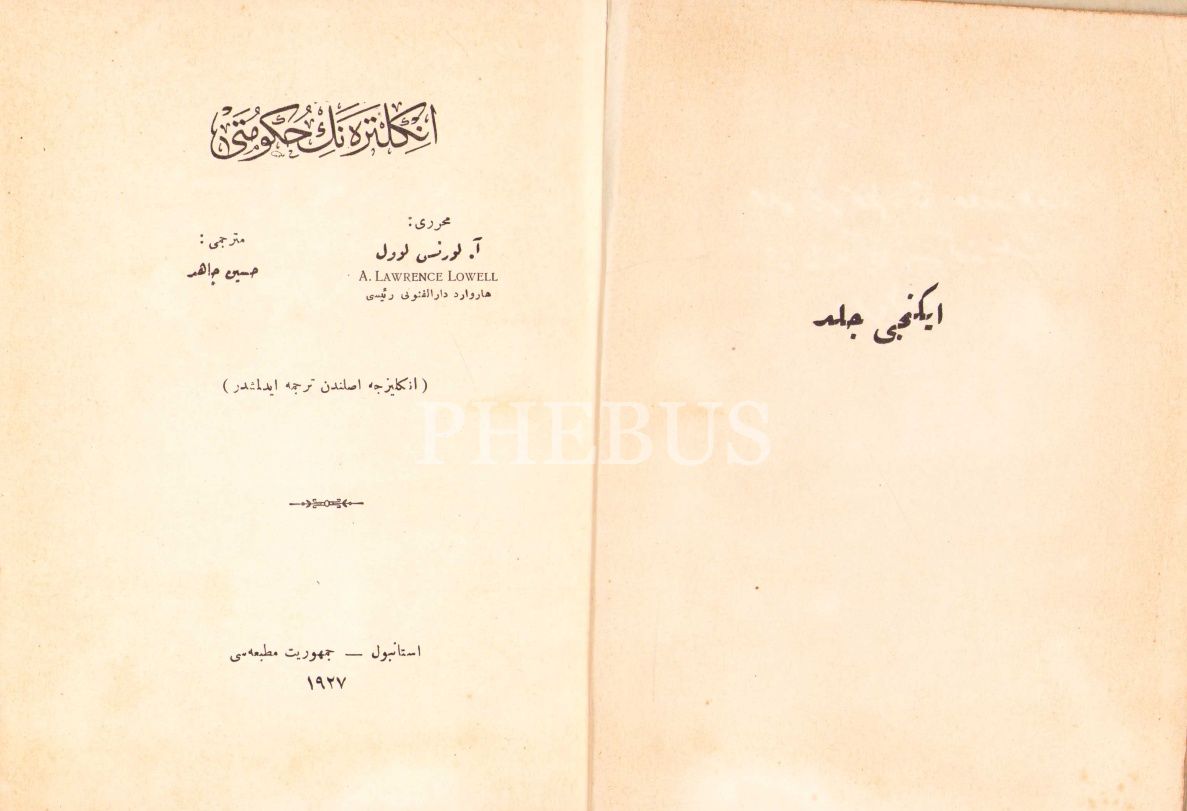 Osmanlıca İngiltere'nin Hükûmeti [5 cilt], A. Lawrance Lowell, çev. Hüseyin Câhid, Ahmed İhsan, Cumhuriyet, Akşam Matbaaları, İstanbul 1927, ciltler hâliyle, 14x20 cm