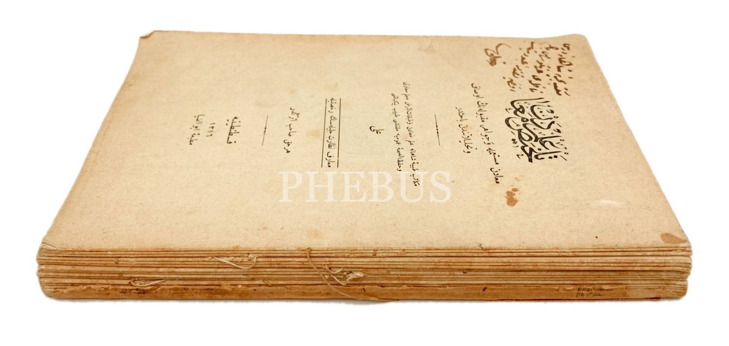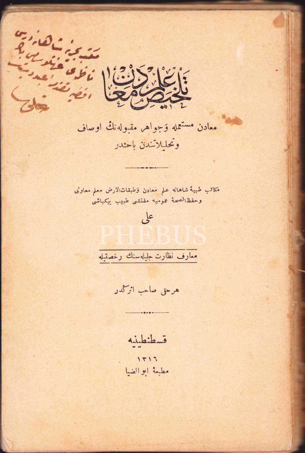 Osmanlıca Telhîs-i İlm-i Maâdin, Tabib Binbaşı Ali, yazarından ithaflı ve imzalı, Ebüzziya Matbaası, Kostantiniye [İstanbul] 1316, 281 s., 12x18 cm, ön kapak eksik ve dağınık haliyle
