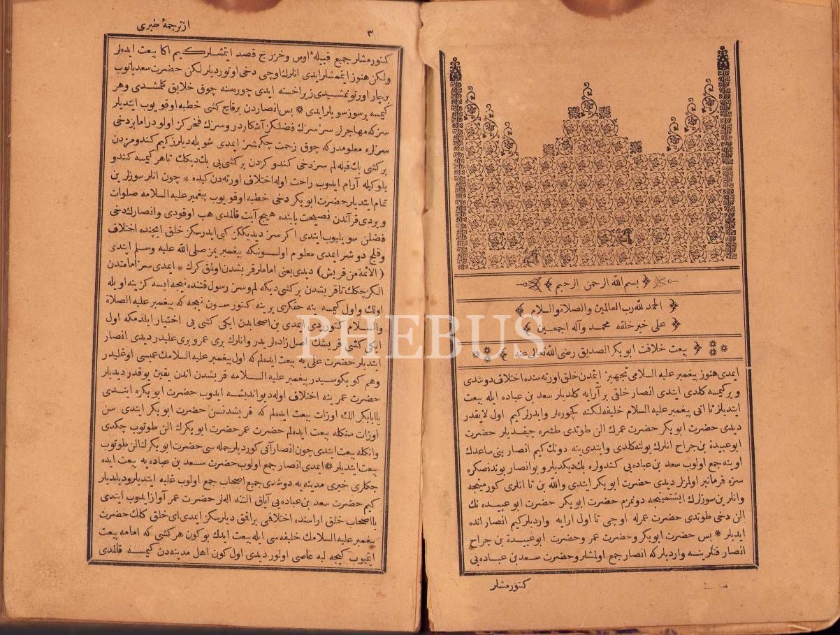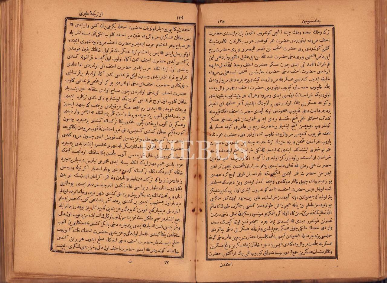 Osmanlıca Taberî Tarihi Tercümesi 3. Cilt [Hz. Ebu Bekir'in hilafetinden Muktedir Billah'ın hilafetine kadarki dönem], İzzet ve Ali Efendi Matbaası, İstanbul 1290, 566 s., 15x23 cm, cildi ve ilk birkaç sayfası yıpranmış haliyle