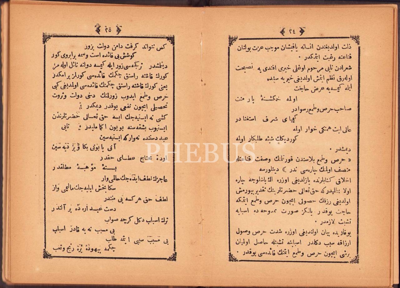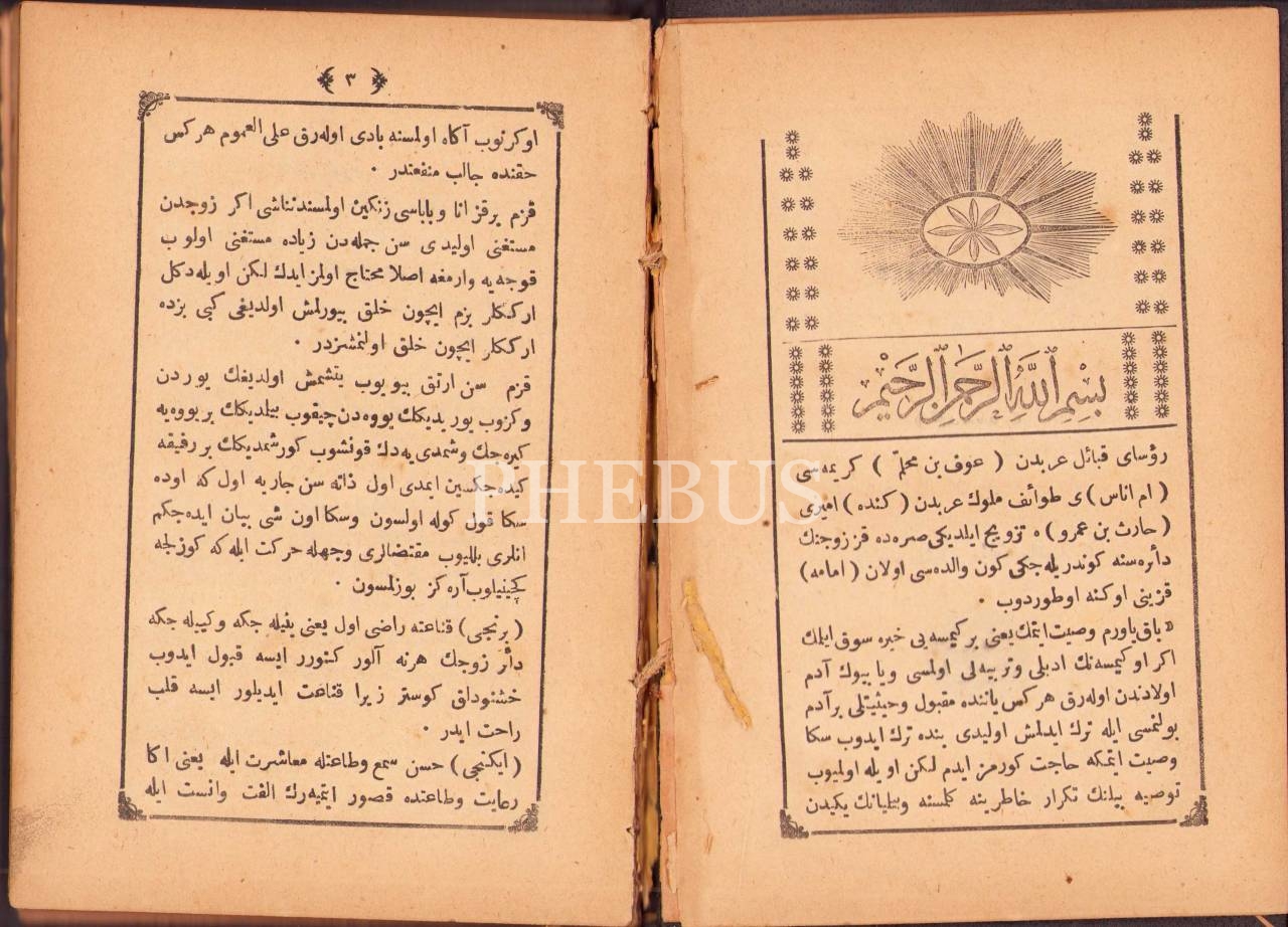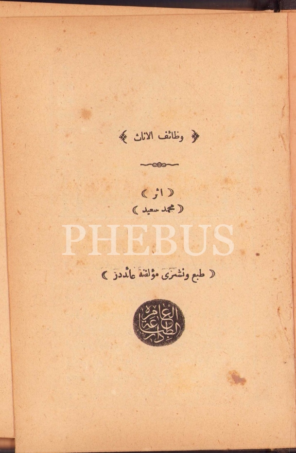 Osmanlıca Vezâifü'l-İnâs [Hanımların Görevleri], Mehmed Said, Âmire Matbaası, 1294, 154 s., 12x18 cm, sırtı ayrık ve son sayfası kopuk haliyle