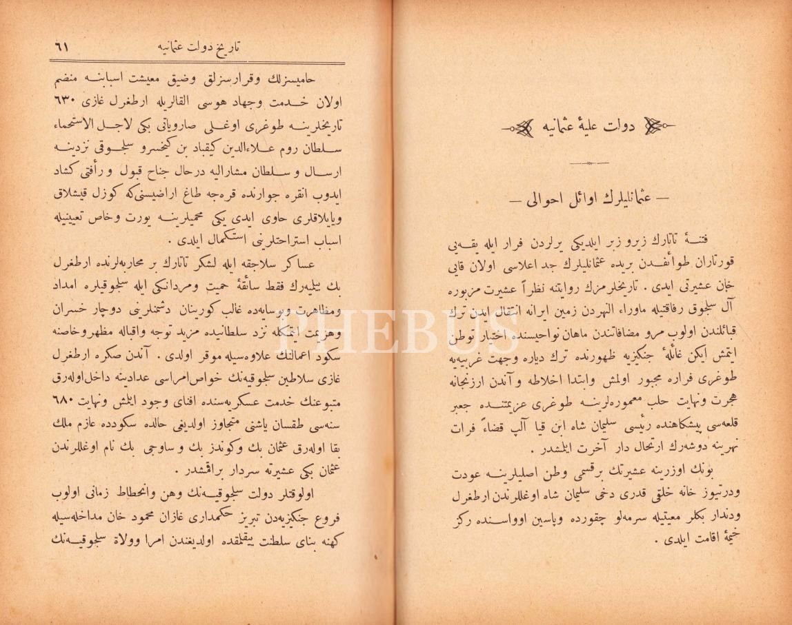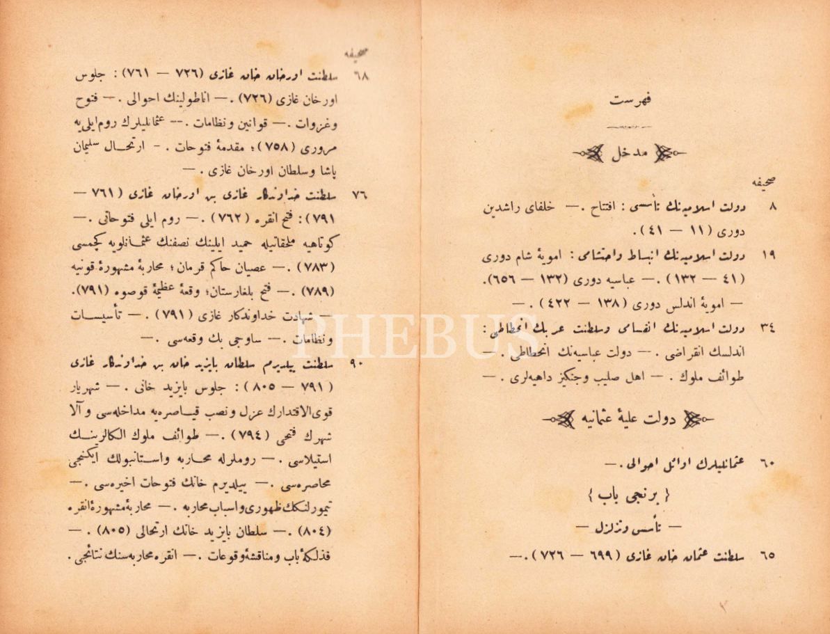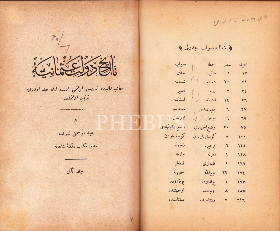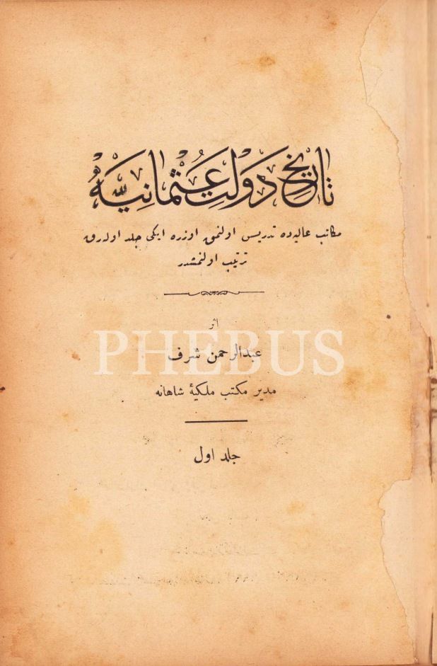 Osmanlıca Târîh-i Devlet-i Osmaniye [2 cilt], Abdurrahman Şeref, 363+513 s., 14x20 cm, cildi yıpranmış ve künye sayfası eksik, son sayfası yırtık haliyle