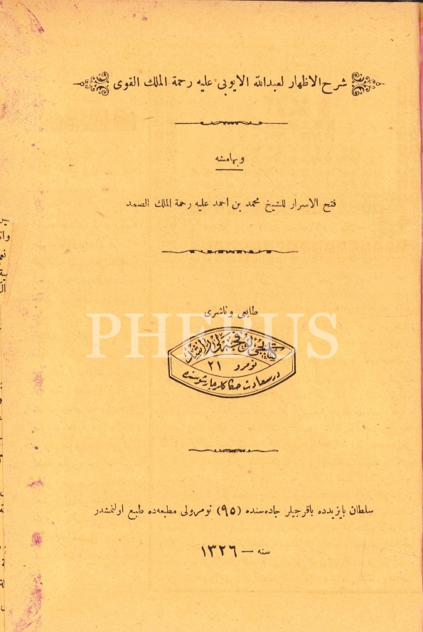 Arapça Şerhü'l-İzhâr, şerheden: Abdullah el-Eyyubî; derkenar olarak Fethü'l-Esrâr, Şeyh Muhammed b. Ahmed, İstanbul 1326, 293 s., 17x24 cm, cildi yıpranmış haliyle