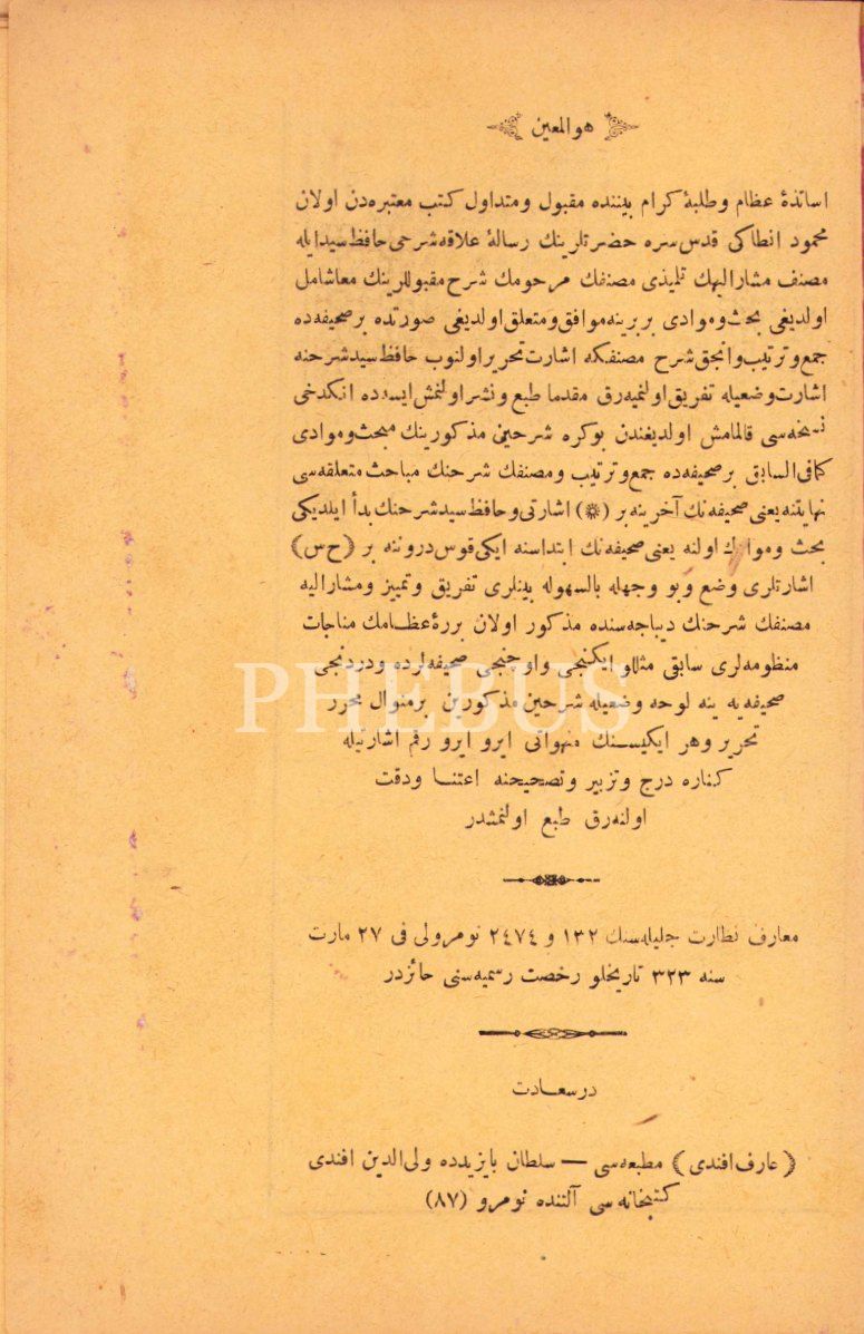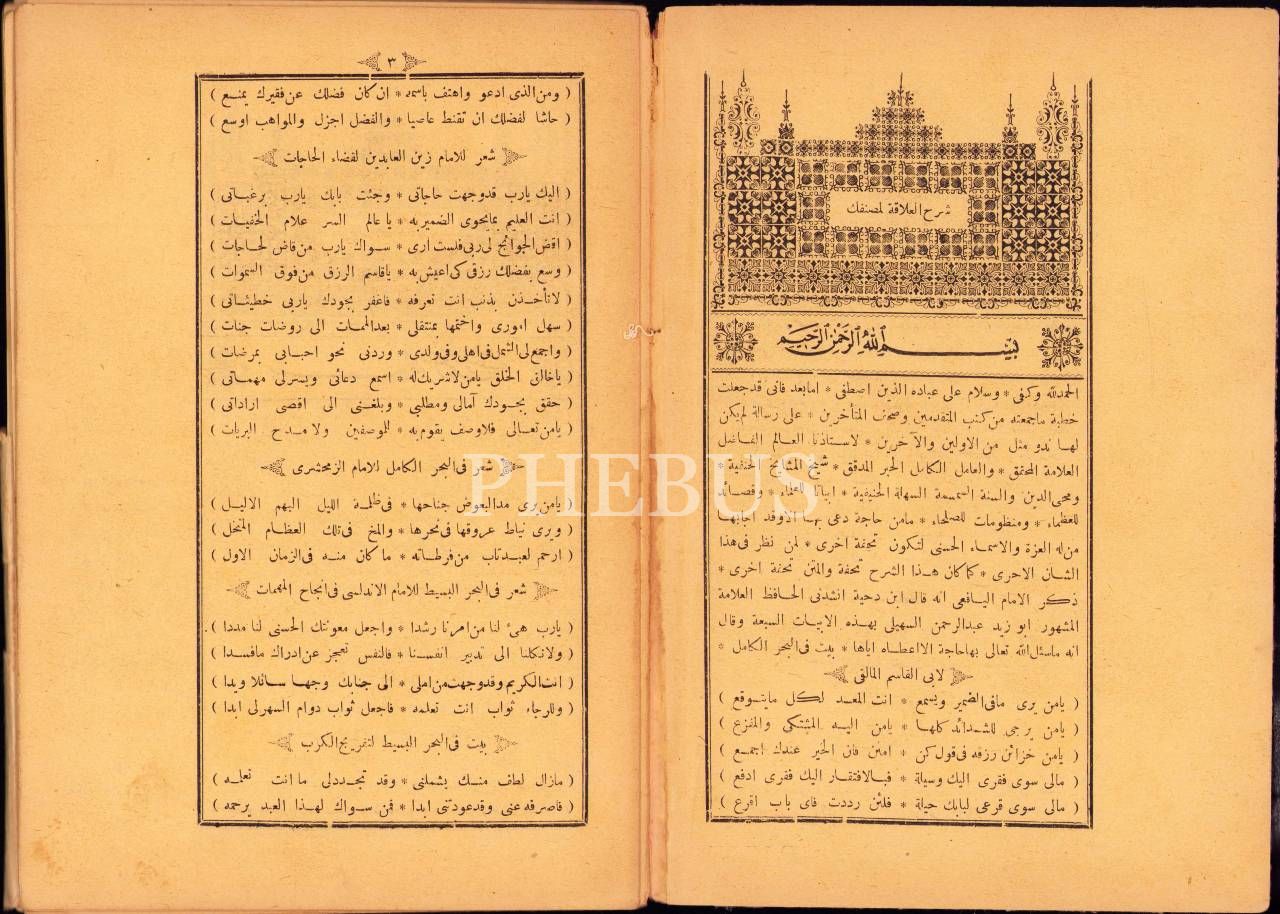Arapça Şerhu'l-Alâka li-Musannifek, Arif Efendi Matbaası, Dersaadet [İstanbul], 136 s. (aradan 4 sayfa eksik), 16x24 cm, cildi yıpranmış haliyle